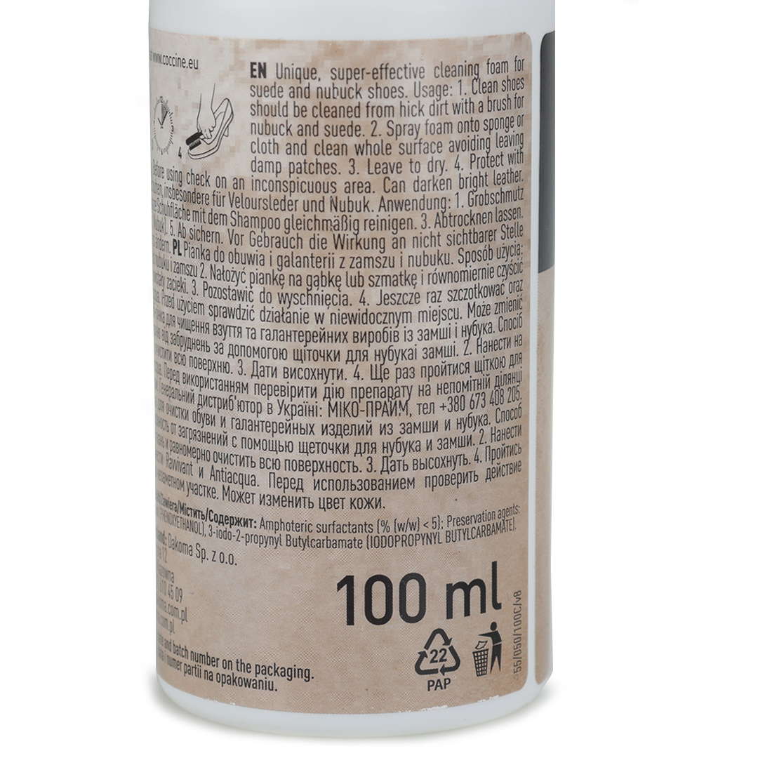 Pianka czyszczącado każdego rodzaju skór i tekstyliów. Zalecana szczególnie do obuwiazamszowego - nie zlepia włosków. Wydajny preparat starczający nawielokrotne użycie.
