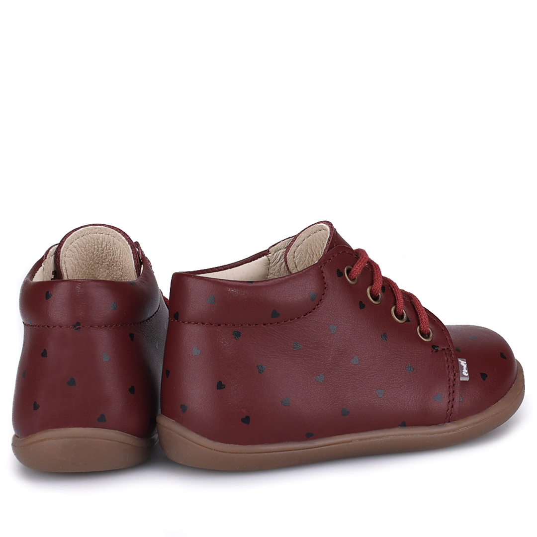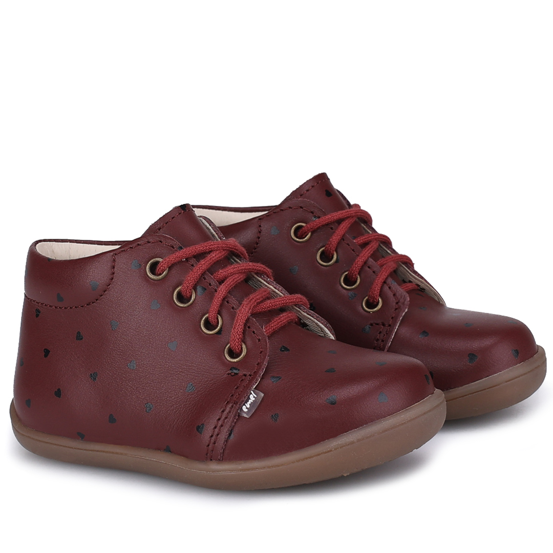Bordowe trzewiki dziecięce Arno Barefoot w czarne serduszka
