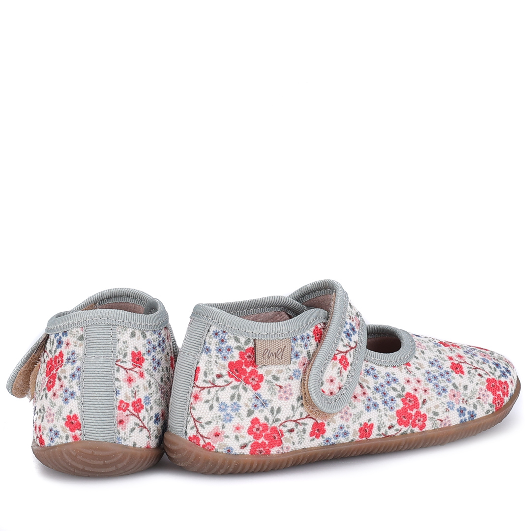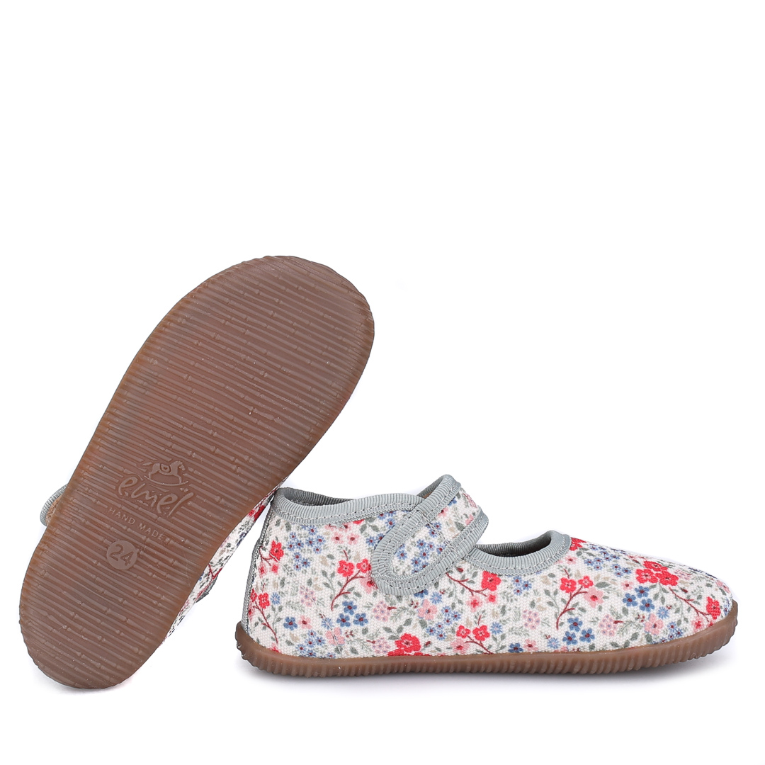 Kolorowe kapcie Emel w kwiatuszki z miętową lamówką mają subtelny, wiosenny wzór i balerinowy krój, który zapewnia lekkość oraz przewiewność. Kapcie są miękkie, elastyczne i super lekkie, gwarantując swobodę ruchu podczas zabawy.