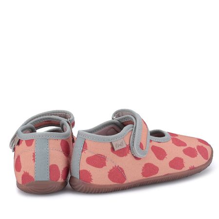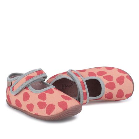 Pomarańczowe kapcie Emel w truskawki z miętową lamówką mają radosny, letni wzór i balerinowy krój, który zapewnia lekkość oraz przewiewność. Kapcie są miękkie, elastyczne i super lekkie, gwarantując swobodę ruchu podczas zabawy.