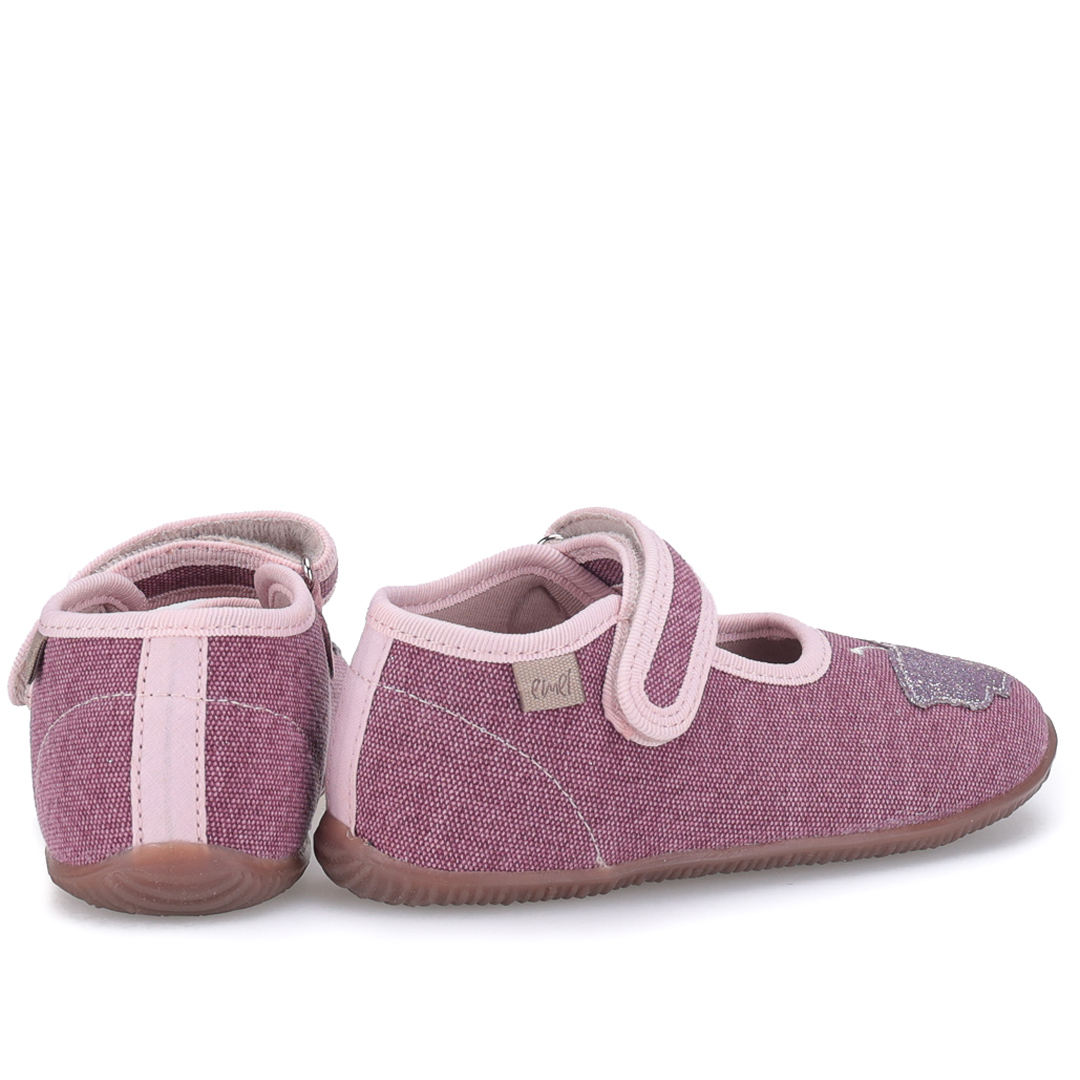 Fioletowe kapcie Emel z błyszczącym motylkiem mają uroczy, przyciągający wzrok akcent i balerinowy krój, który zapewnia lekkość oraz przewiewność. Kapcie są miękkie, elastyczne i super lekkie, gwarantując swobodę ruchu podczas zabawy.