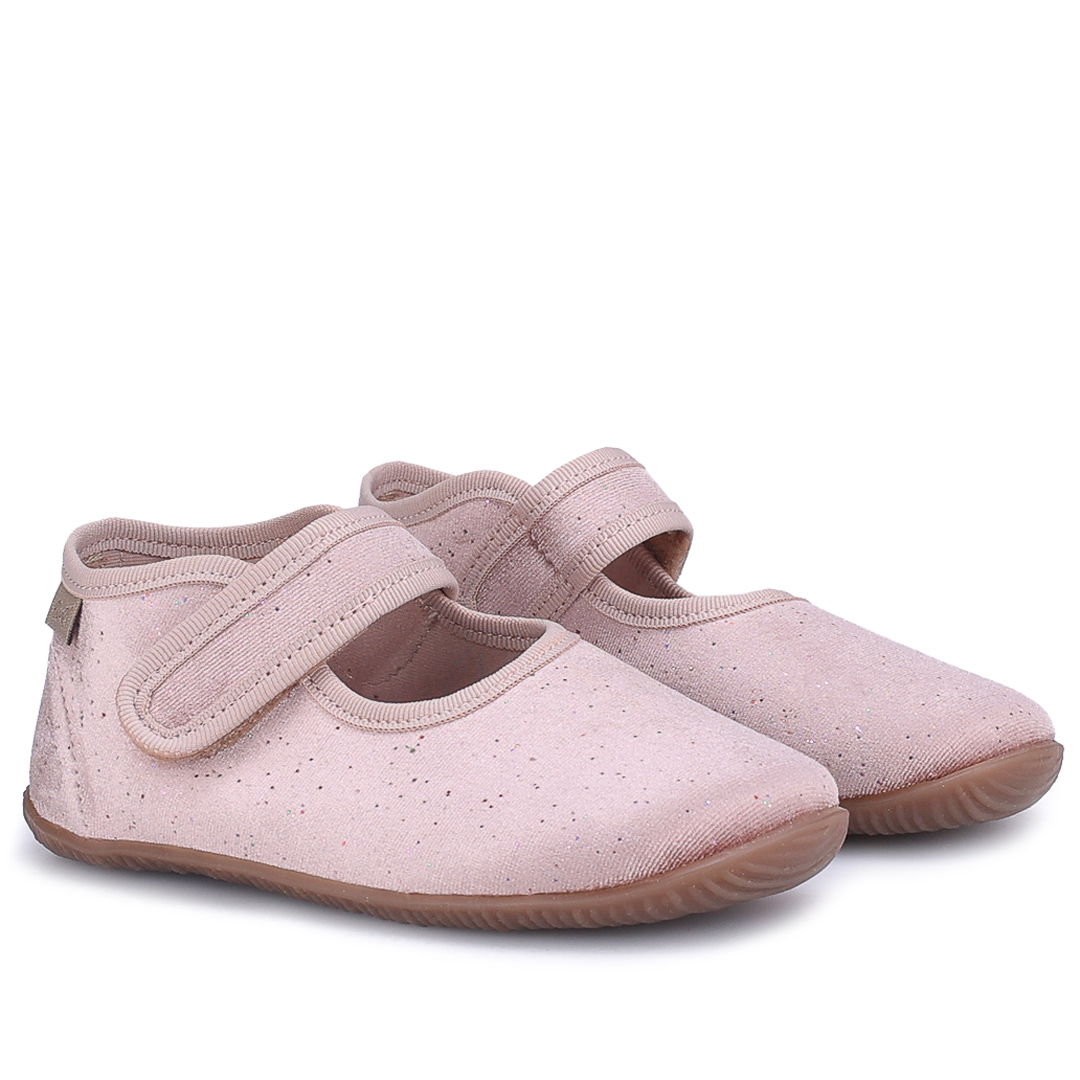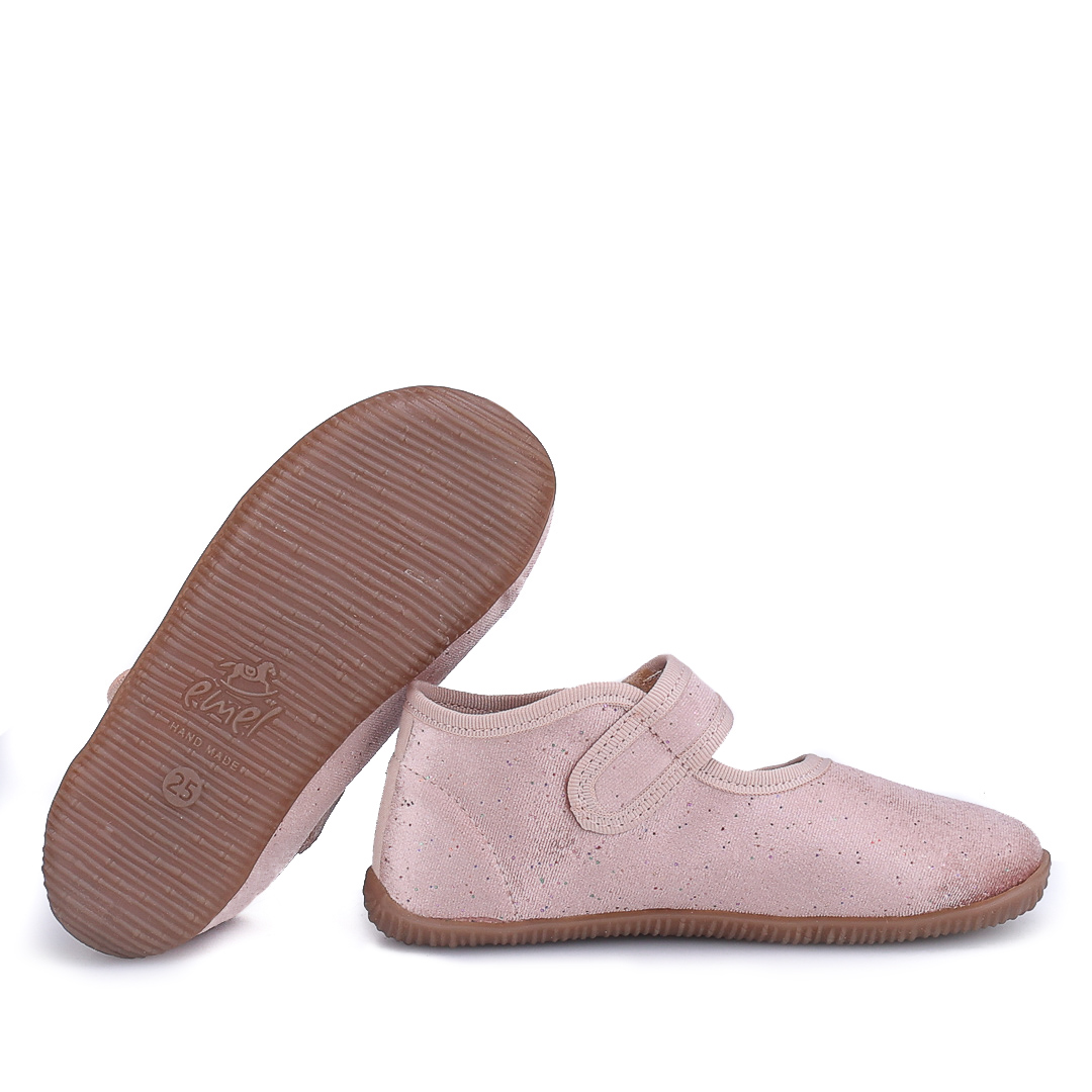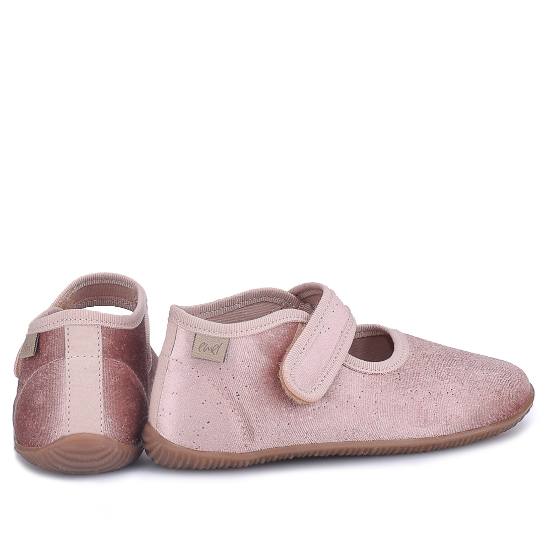 Różowe kapcie Emel z subtelnym, brokatowym wykończeniem mają otwartą, lekką konstrukcję i rzep z przelotką dla łatwego zakładania. Kapcie są mięciutkie, elastyczne i super lekkie, zapewniając swobodę ruchu i przewiewność w cieplejsze dni.