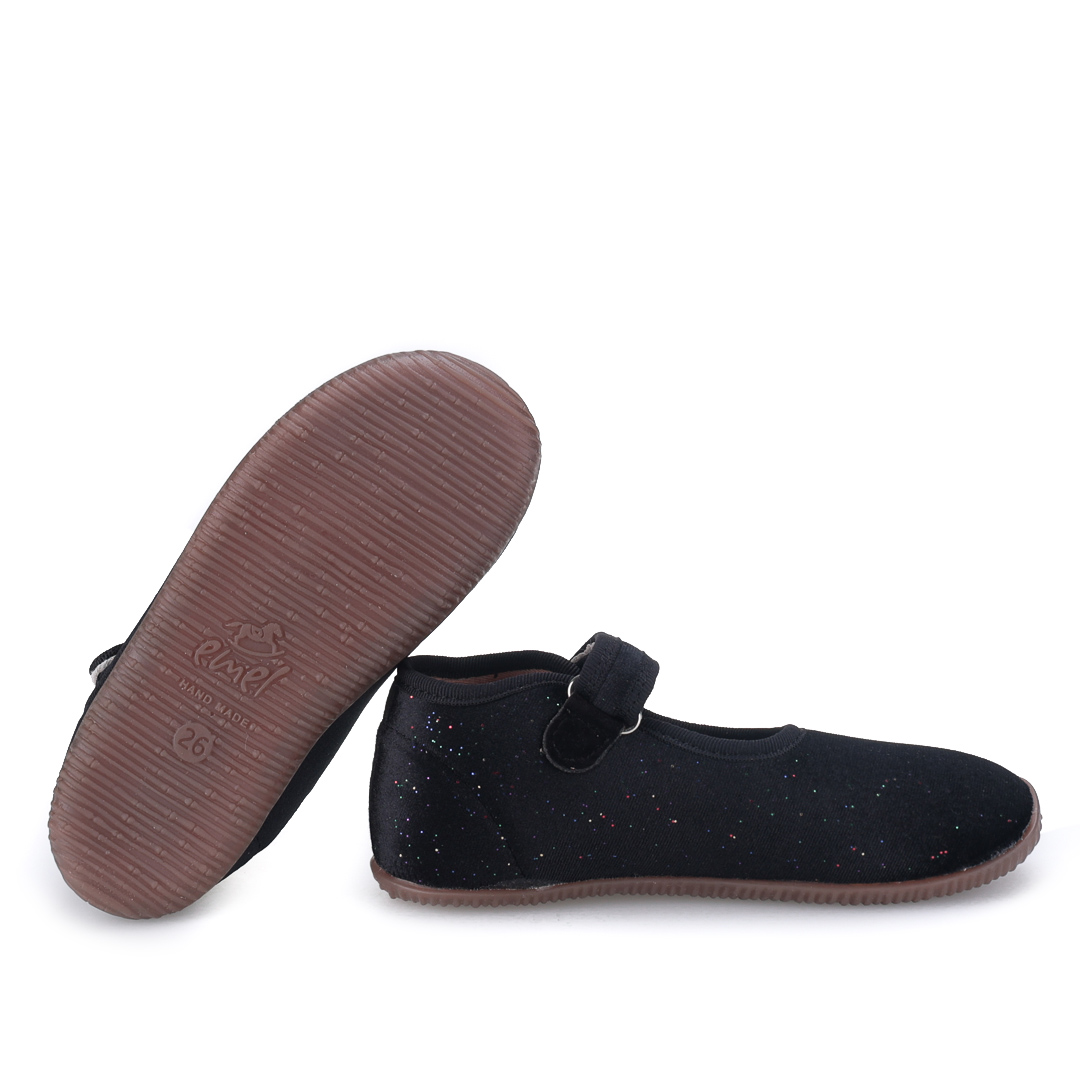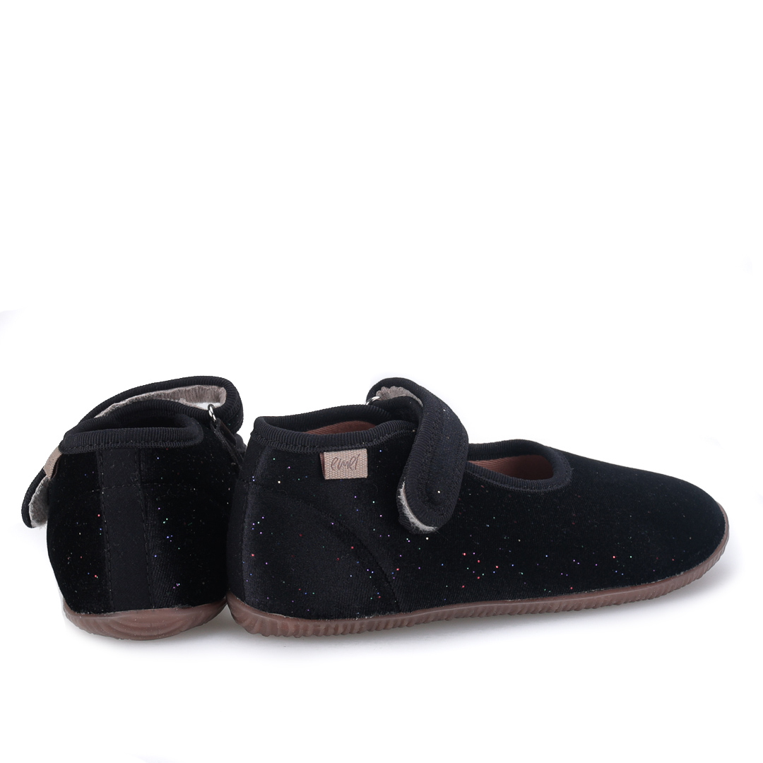 Czarne kapcie Emel z subtelnym, brokatowym wykończeniem mają otwartą, lekką konstrukcję i rzep z przelotką dla łatwego zakładania. Kapcie są mięciutkie, elastyczne i super lekkie, zapewniając swobodę ruchu i przewiewność w cieplejsze dni.