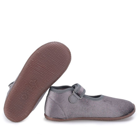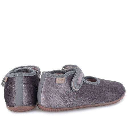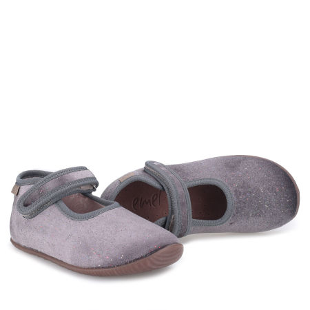 Szare kapcie Emel z subtelnym, brokatowym wykończeniem mają otwartą, lekką konstrukcję i rzep z przelotką dla łatwego zakładania. Kapcie są mięciutkie, elastyczne i super lekkie, zapewniając swobodę ruchu i przewiewność w cieplejsze dni.