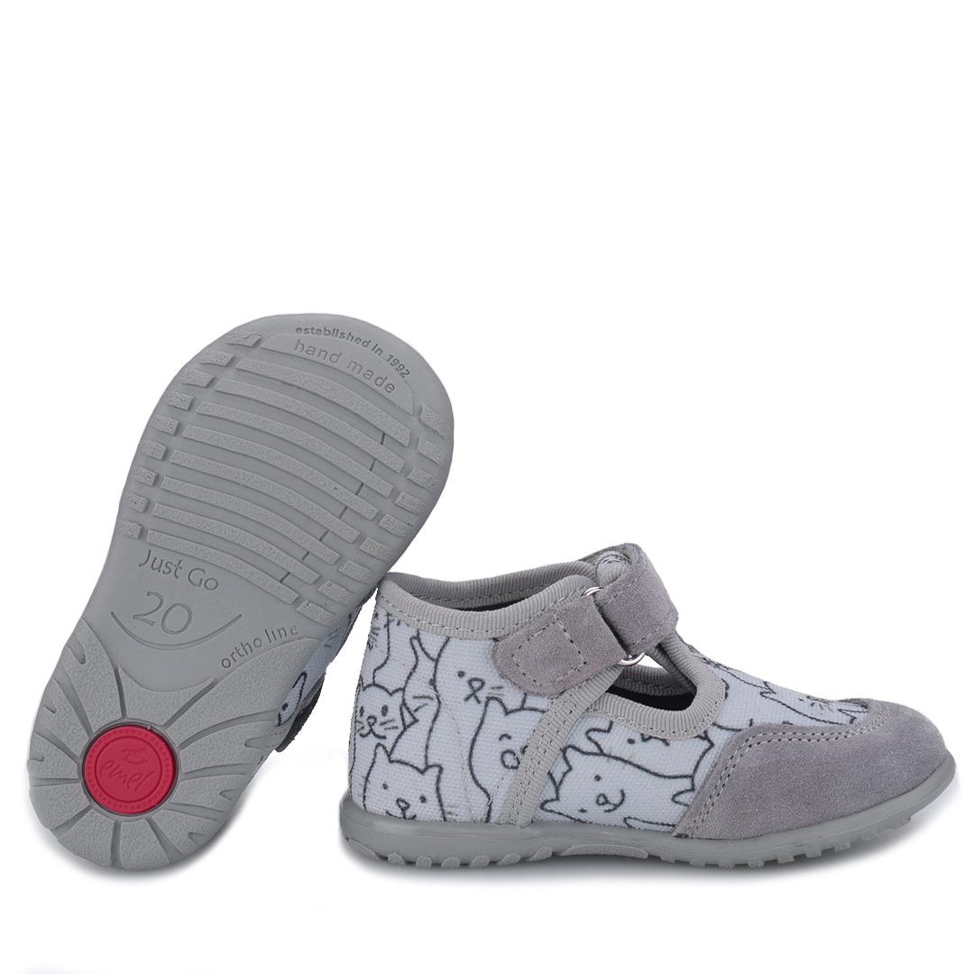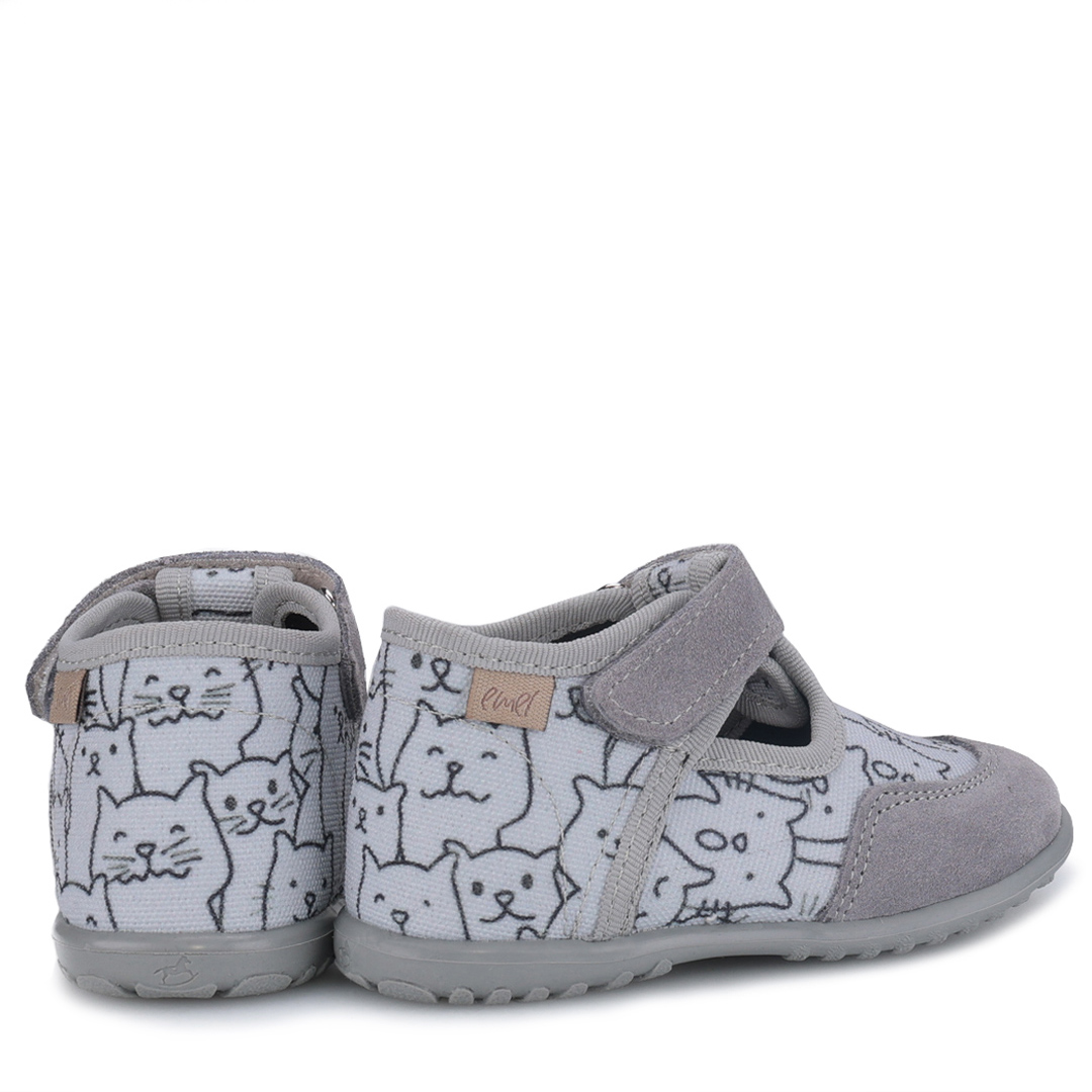 Parametry techniczne: Kategoria: Obuwie tekstylne, Kapcie, Sandałki Kolorystyka: szare Zapięcie: rzep Spód: termokauczuk Wyściółka: skóra naturalna Materiał wierzchni: 100% poliester z recyklingu, skóra naturalna welurowa Podszewka: bawełna z dodatkiem elastanu Wyprodukowano przez: Emel s.c. w Polsce