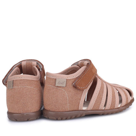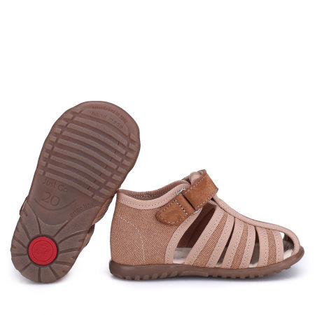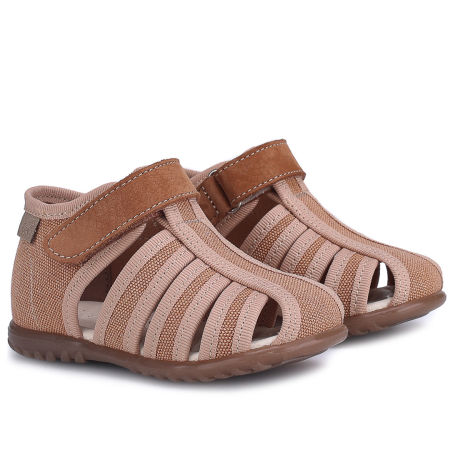 Jasnobrązowa kolorystyka nadaje kapciom ciepłego i naturalnego charakteru, pasując do wielu dziecięcych stylizacji. Delikatne różnice w odcieniu materiału wynikają z ręcznego wykonania oraz zastosowania tkanin pochodzących z recyklingu, co nadaje każdej parze unikalny charakter i podkreśla rzemieślniczy kunszt Emel.