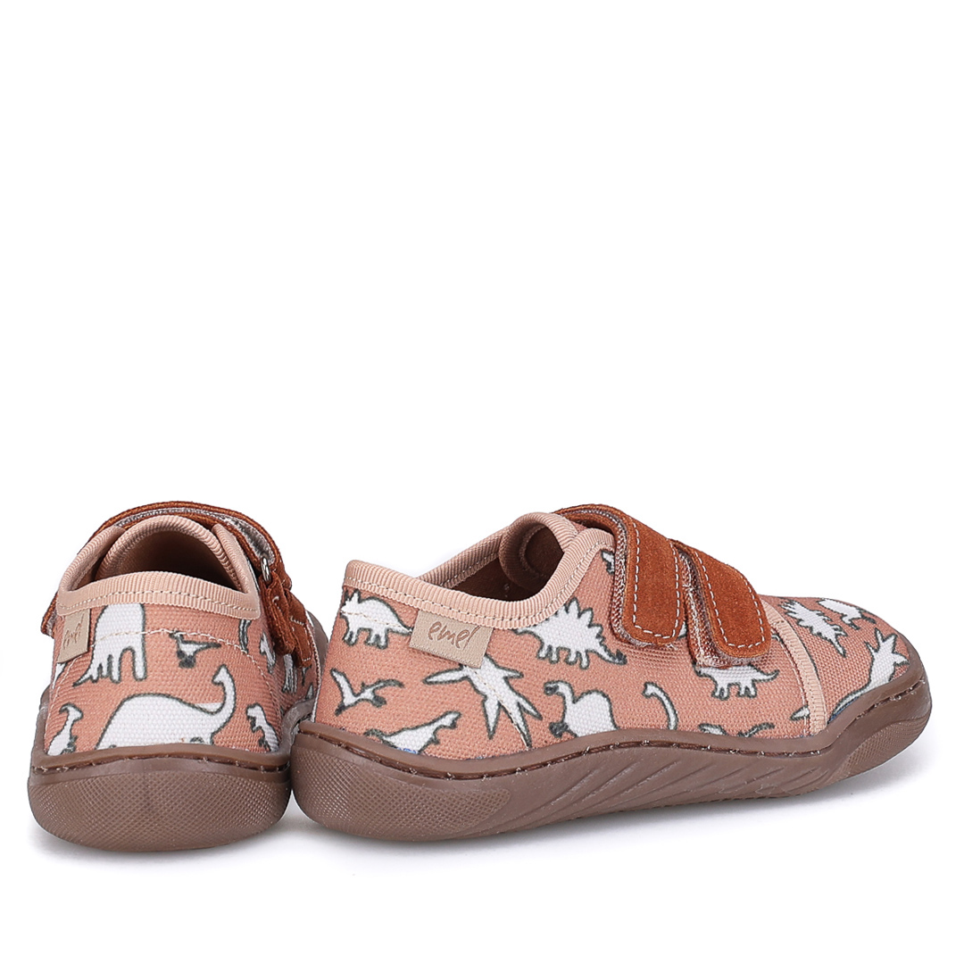 Brązowe tenisówki Emel mają anatomiczną podeszwę i krój wspierający prawidłowy rozwój stóp. Motyw dinozaurów nadaje im atrakcyjny, dziecięcy charakter. Kapcie są miękkie, elastyczne i super lekkie, zapewniając swobodę ruchu podczas zabawy.