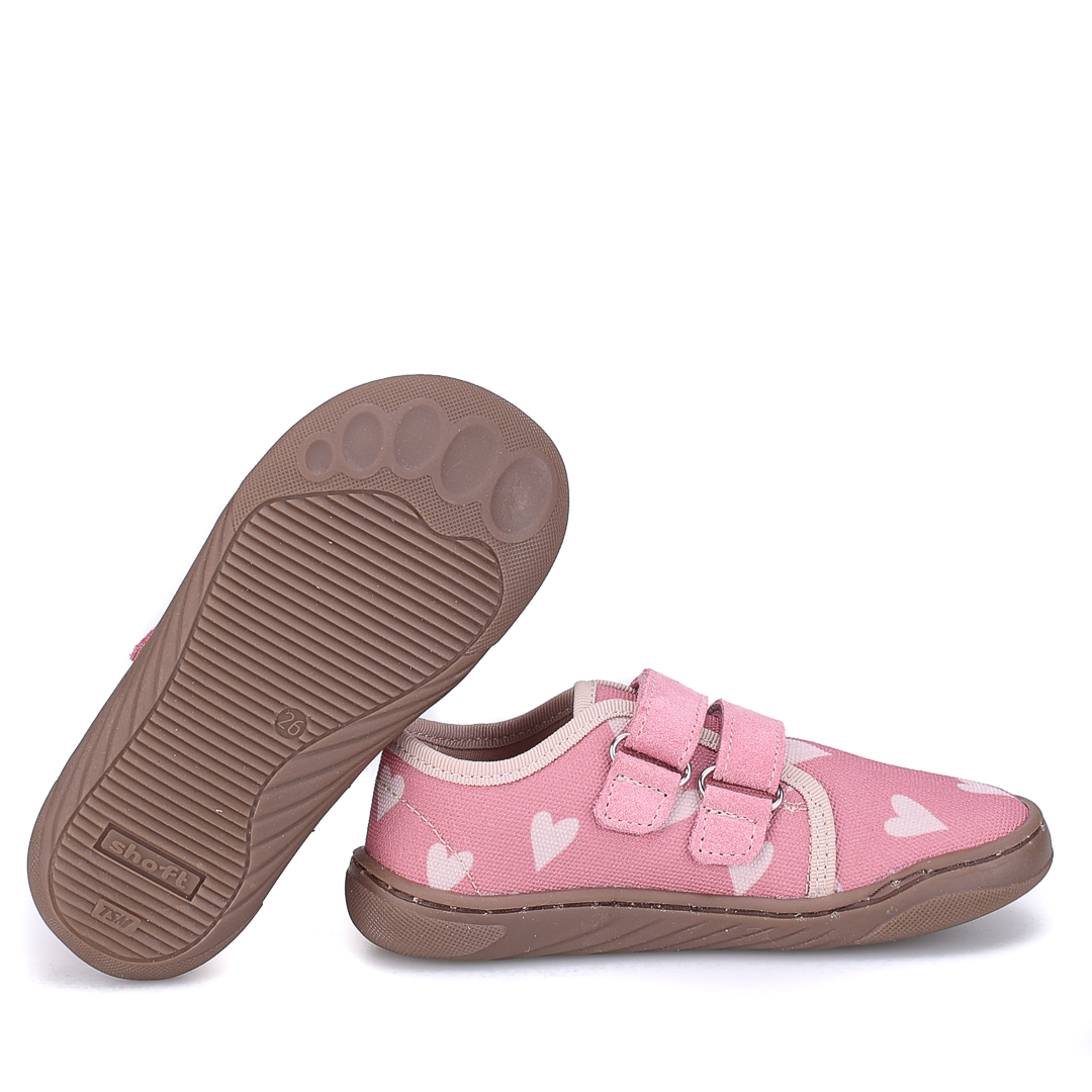 Parametry techniczne: Kategoria: Obuwie tekstylne, Tenisówki, Barefoot Kolorystyka: różowe Zapięcie: dwa rzepy Spód: termokauczuk, anatomiczny kształt Wyściółka: skóra naturalna Materiał wierzchni: 100% poliester z recyklingu, skóra naturalna welurowa Podszewka: bawełna z dodatkiem elastanu Wyprodukowano przez: Emel s.c. w Polsce