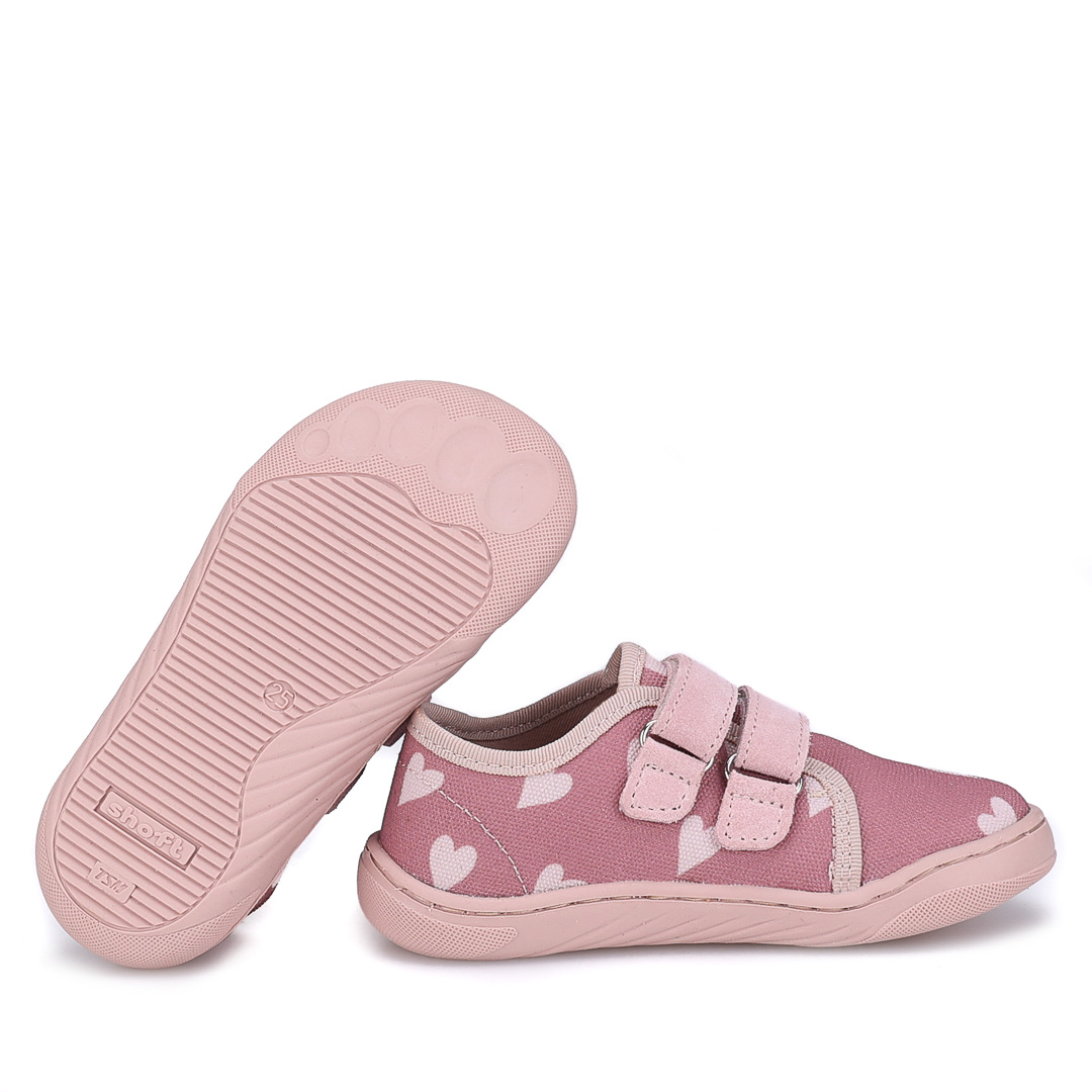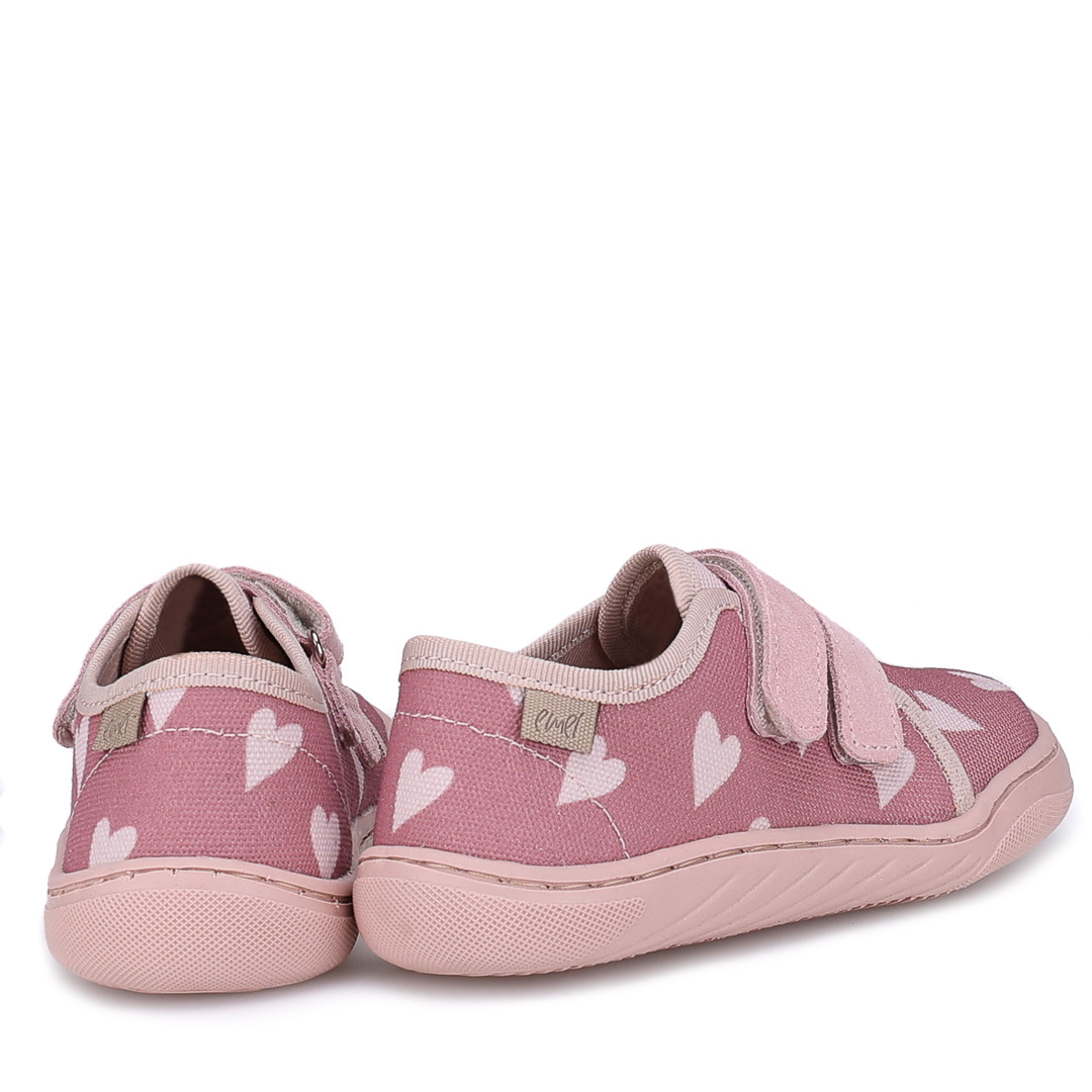 Różowe tenisówki Emel w serduszka mają anatomiczną podeszwę i krój wspierający prawidłowy rozwój stóp. Uroczy, dziewczęcy motyw serduszek nadaje im radosny i przyjazny charakter. Kapcie są miękkie, elastyczne i super lekkie, zapewniając swobodę ruchu podczas zabawy.