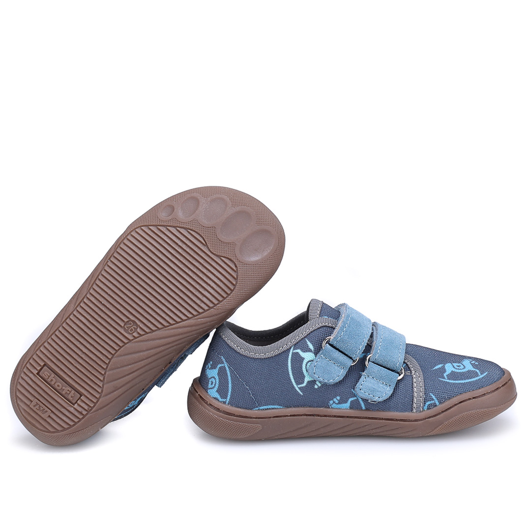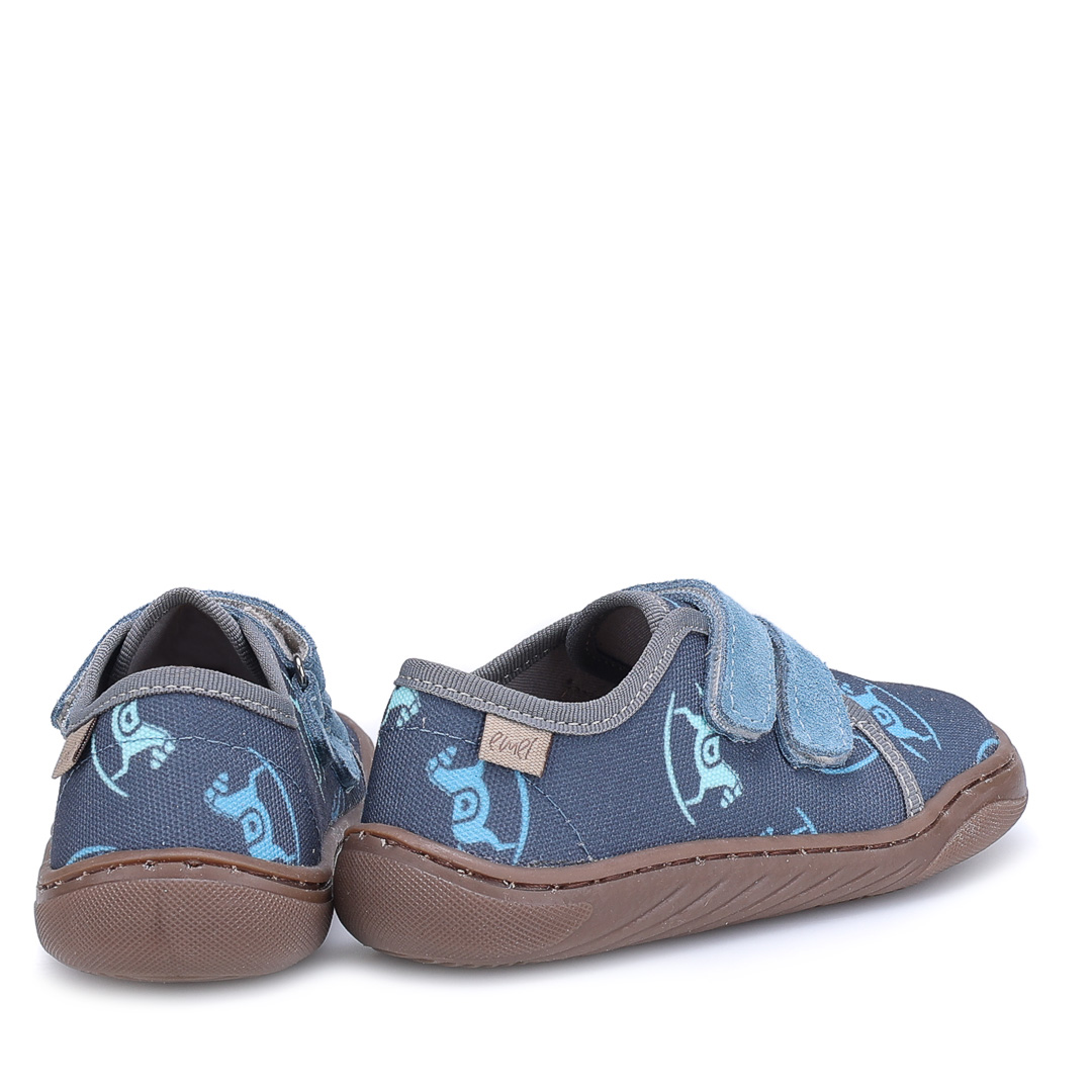 Parametry techniczne: Kategoria: Obuwie tekstylne, Tenisówki, Barefoot Kolorystyka: niebieskie, granatowe Zapięcie: dwa rzepy Spód: termokauczuk, anatomiczny kształt Wyściółka: skóra naturalna Materiał wierzchni: 100% poliester z recyklingu, skóra naturalna welurowa Podszewka: bawełna z dodatkiem elastanu Wyprodukowano przez: Emel s.c. w Polsce