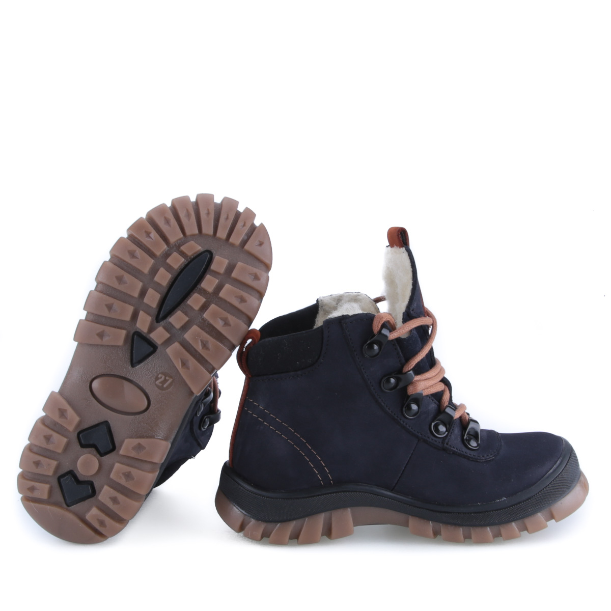 Zimowe buty dziecięce McKinley z granatowego nubuku łączą stabilny trekkingowy fason z komfortem i ciepłem.