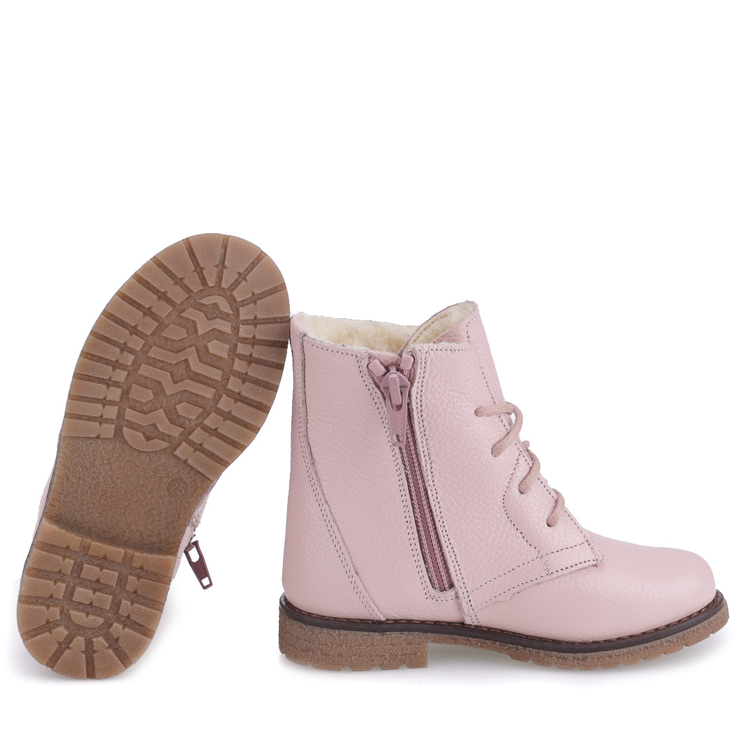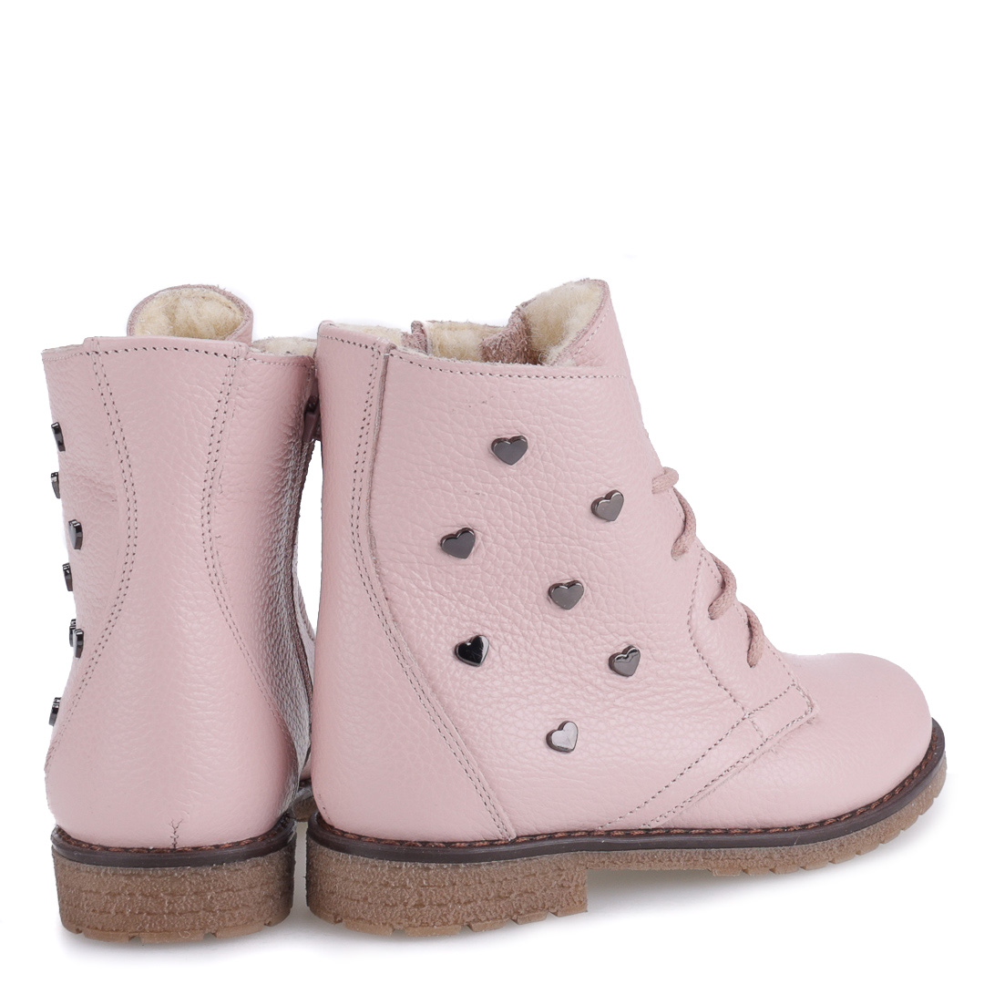 Różowa cholewka nadaje trzewikom dziewczęcego, delikatnego charakteru. Zgrabny fason dobrze dopasowuje się do szczupłych stóp, łącząc elegancki wygląd z codziennym komfortem.
