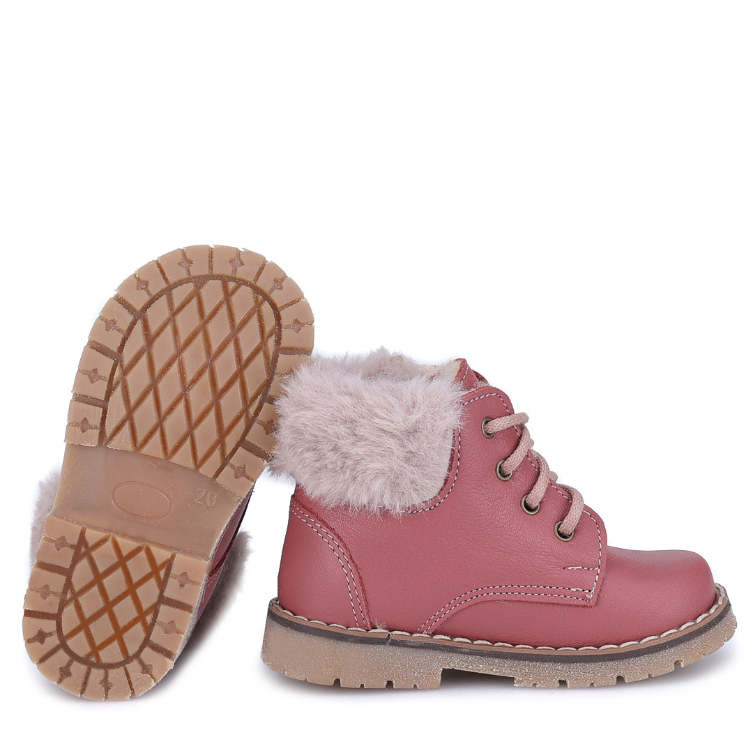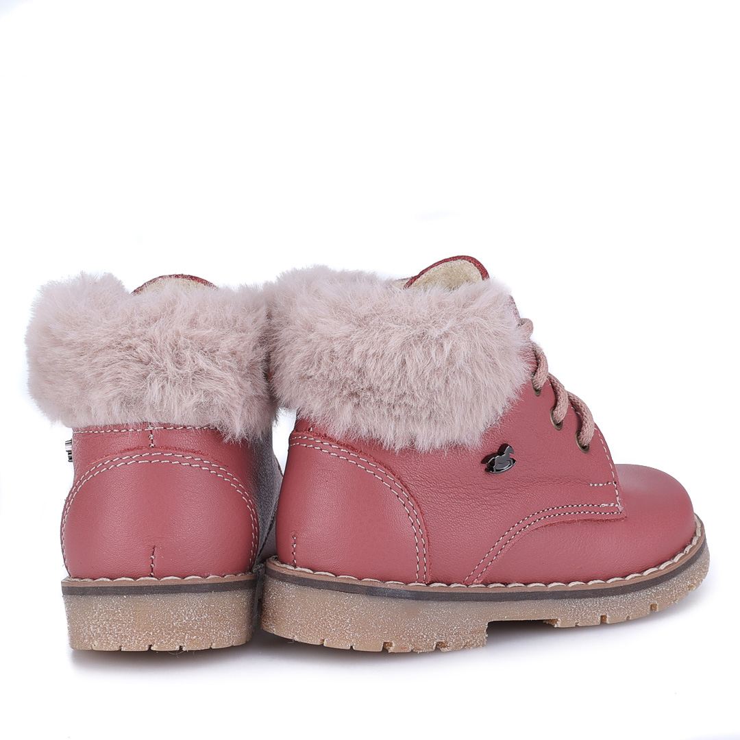 Malinowy odcień skóry licowej w połączeniu z puszystym futerkiem nadaje butom dziewczęcego uroku i zapewnia ciepło podczas zimowych spacerów.