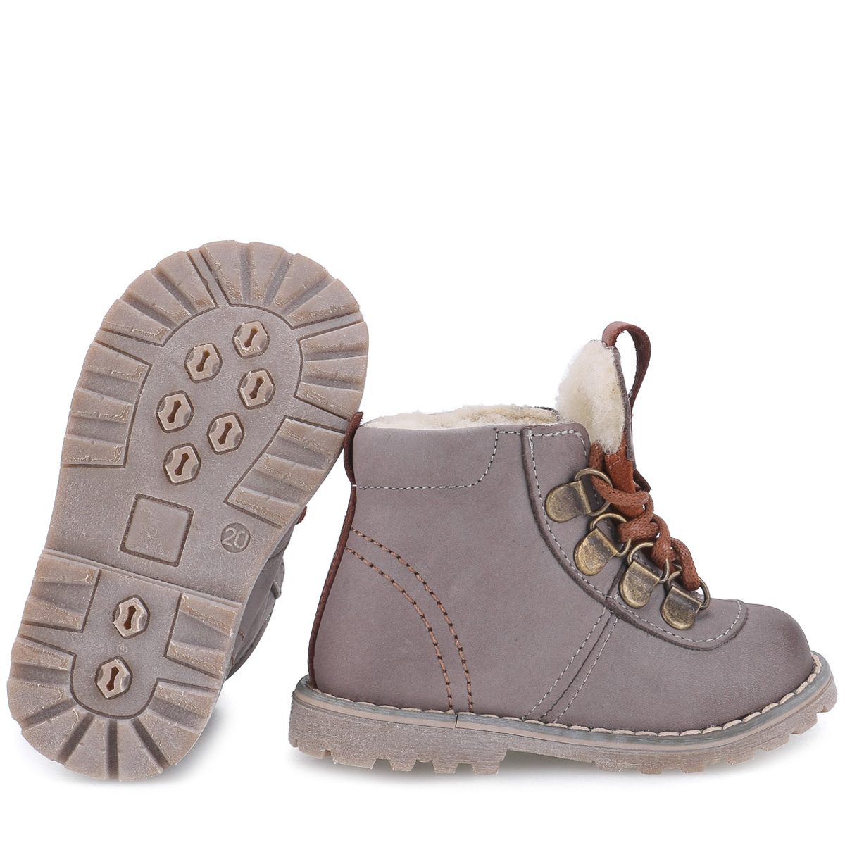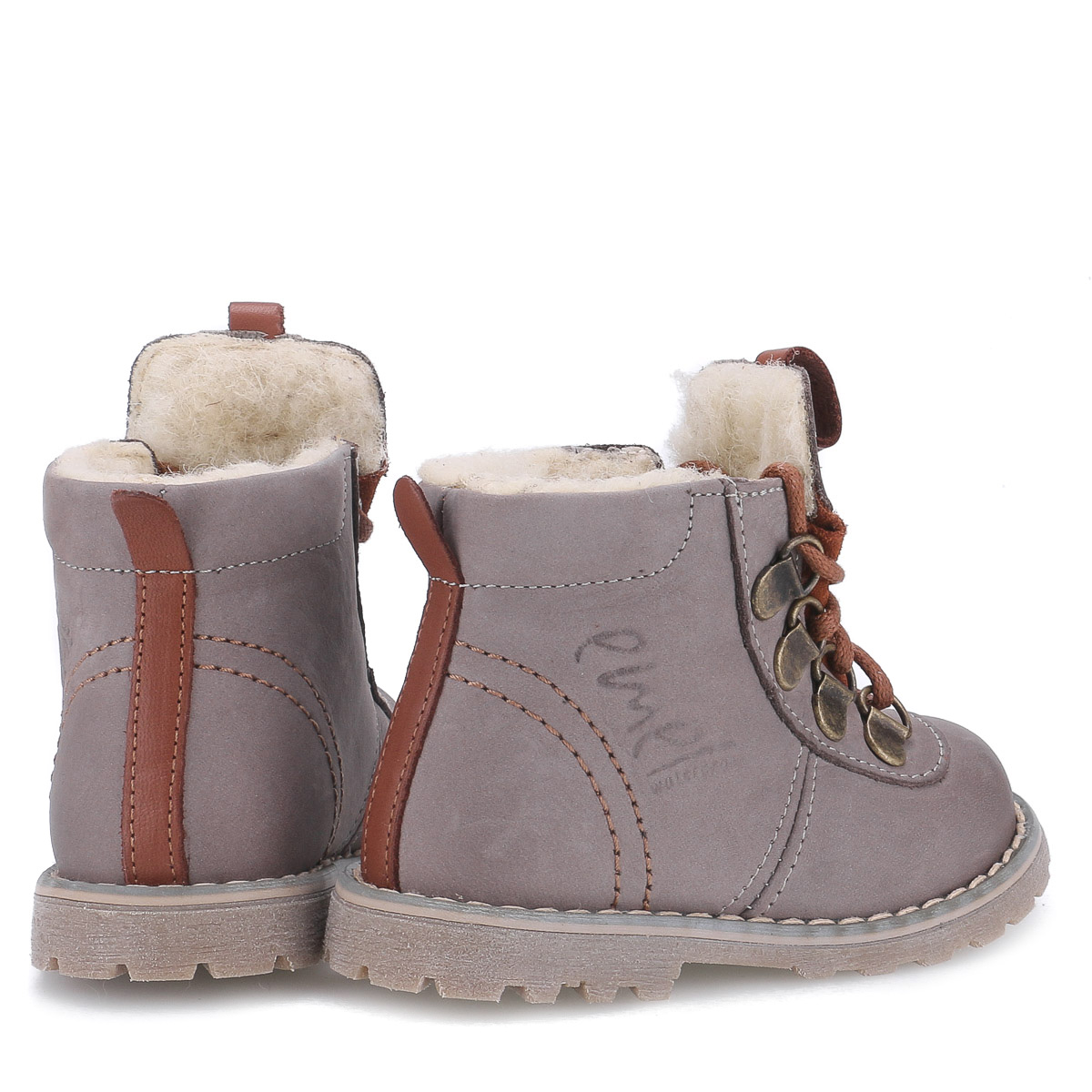 Naturalne materiały – cholewka ze skóry naturalnej nubukowej wolnej od szkodliwych substancji oraz wełniana podszewka dbają o komfort i bezpieczeństwo dziecięcych stóp.