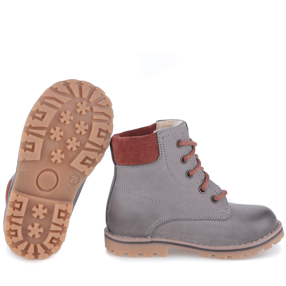 Geneva – szare dziecięce traperki ze skóry naturalnej z brązowymi detalami