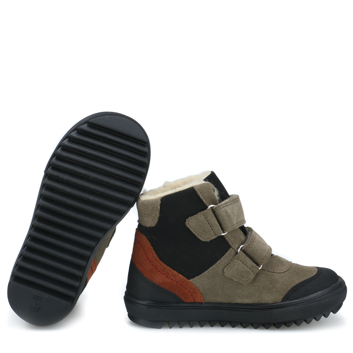 Naturalne zestawienie kolorów – zielona cholewka z brązowymi detalami nadaje butom nowoczesny, sportowy charakter, a solidna podeszwa z głębokim bieżnikiem zapewnia stabilność i wygodę podczas zimowych aktywności dziecięcych.