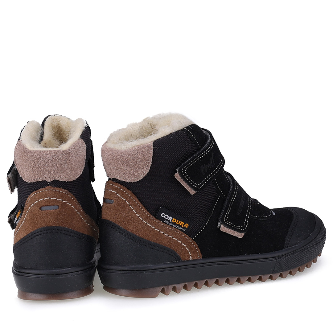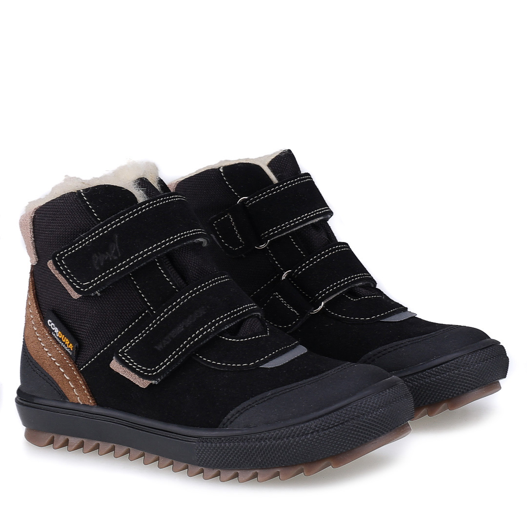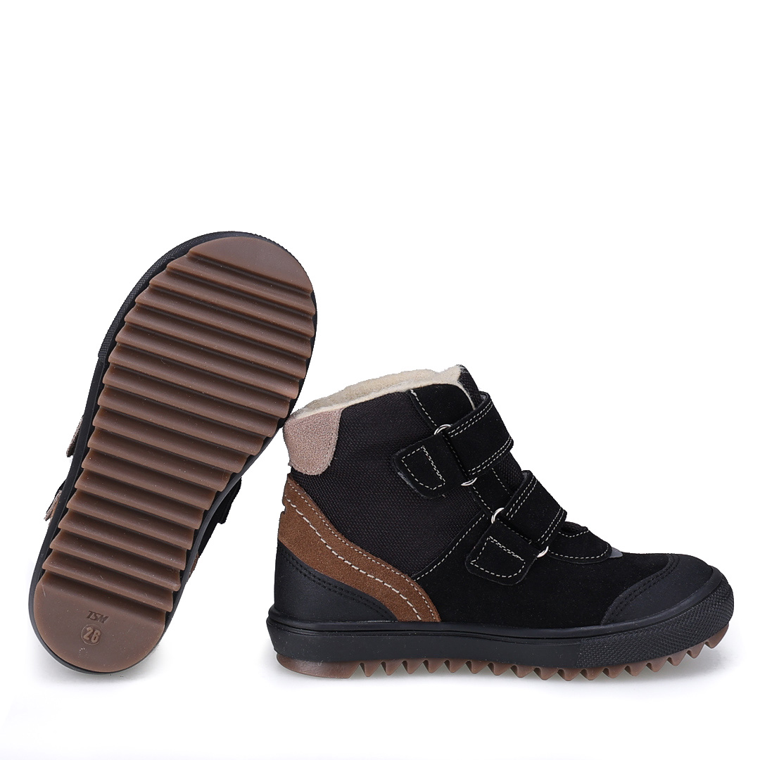 Alaska – czarne dziecięce traperki ze skóry naturalnej z brązowym akcentem