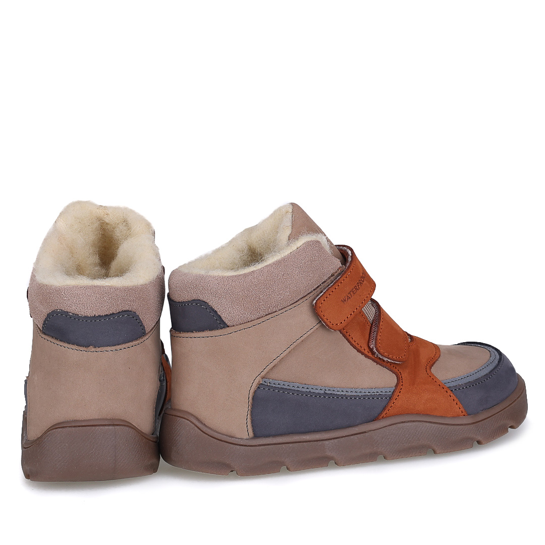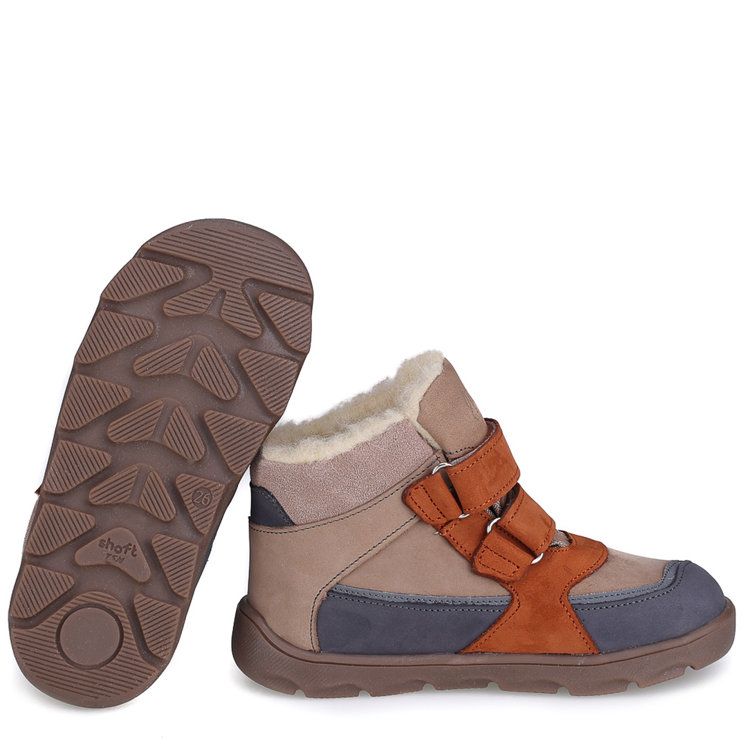 Nubukowe trzewiki dziecięce Atlas Barefoot w odcieniach beżu, brązu i granatu tworzą interesujący zestaw kolorystyczny, który dodaje butom wyrazistości. Subtelne kontrasty między barwami podkreślają sportowy fason i sprawiają, że model świetnie sprawdza się w zimowych stylizacjach.