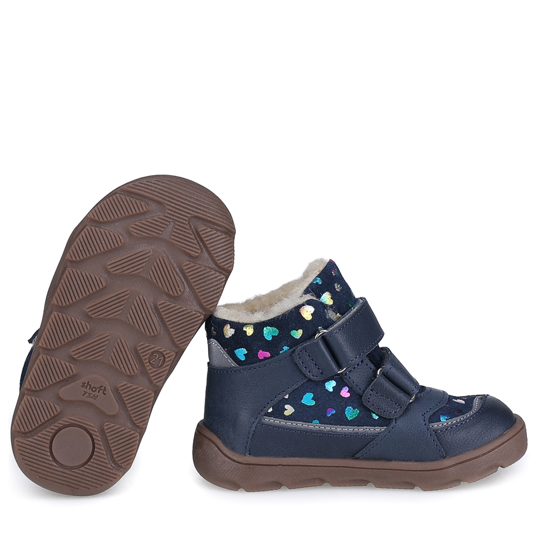 Granatowe trzewiki dziewczęce Atlas Barefoot zdobią mieniące się serduszka, które nadają butom wyjątkowego, radosnego charakteru. Sportowy fason i nowoczesny design sprawiają, że model świetnie sprawdza się w zimowych stylizacjach.