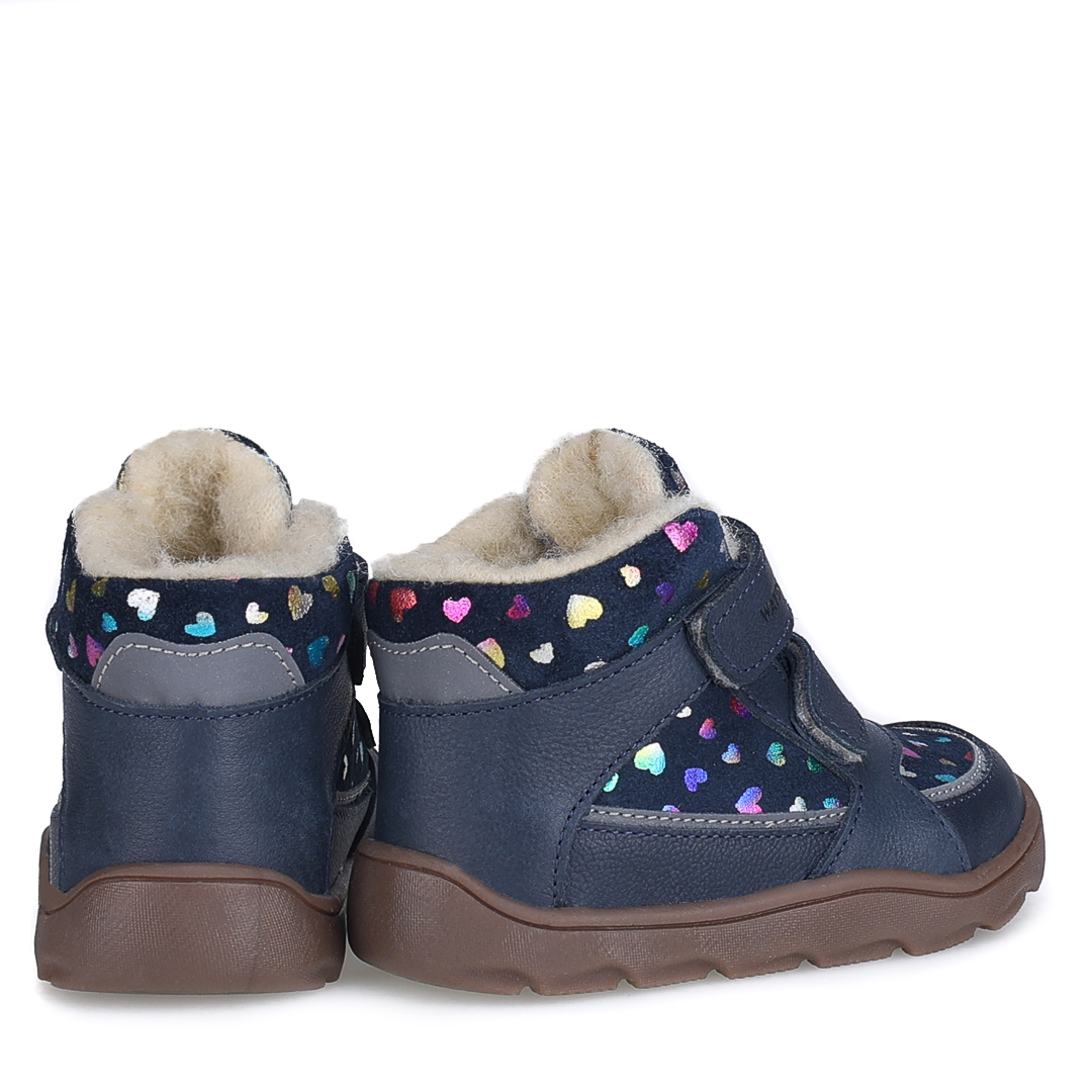 Atlas Barefoot – Granatowe trzewiki dziewczęce z kolorowymi serduszkami