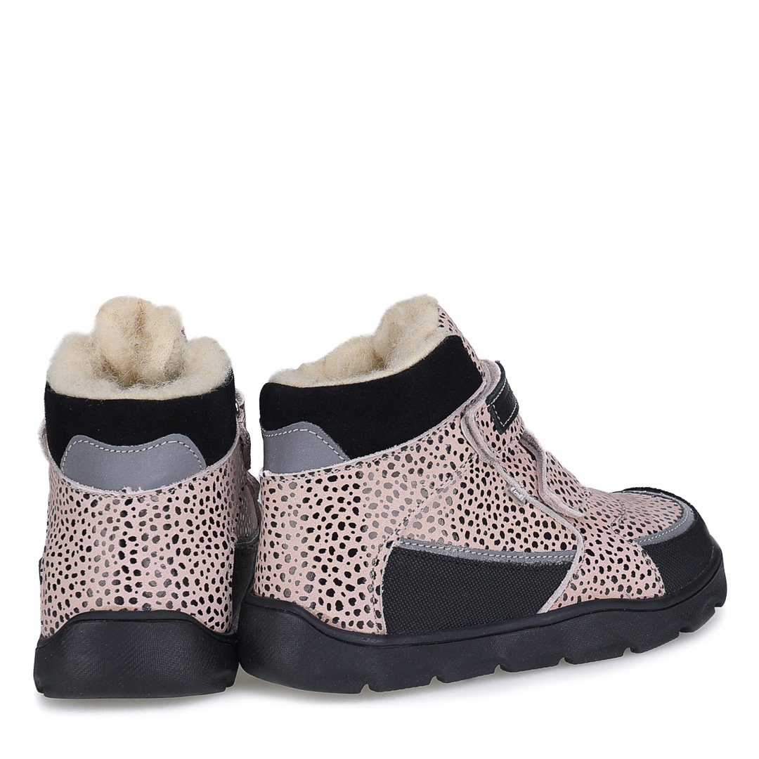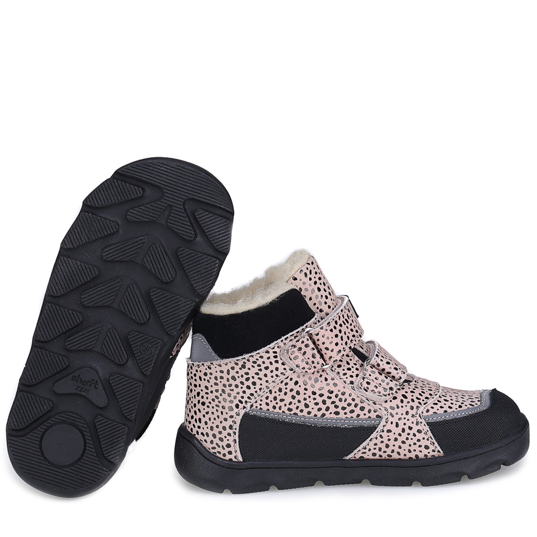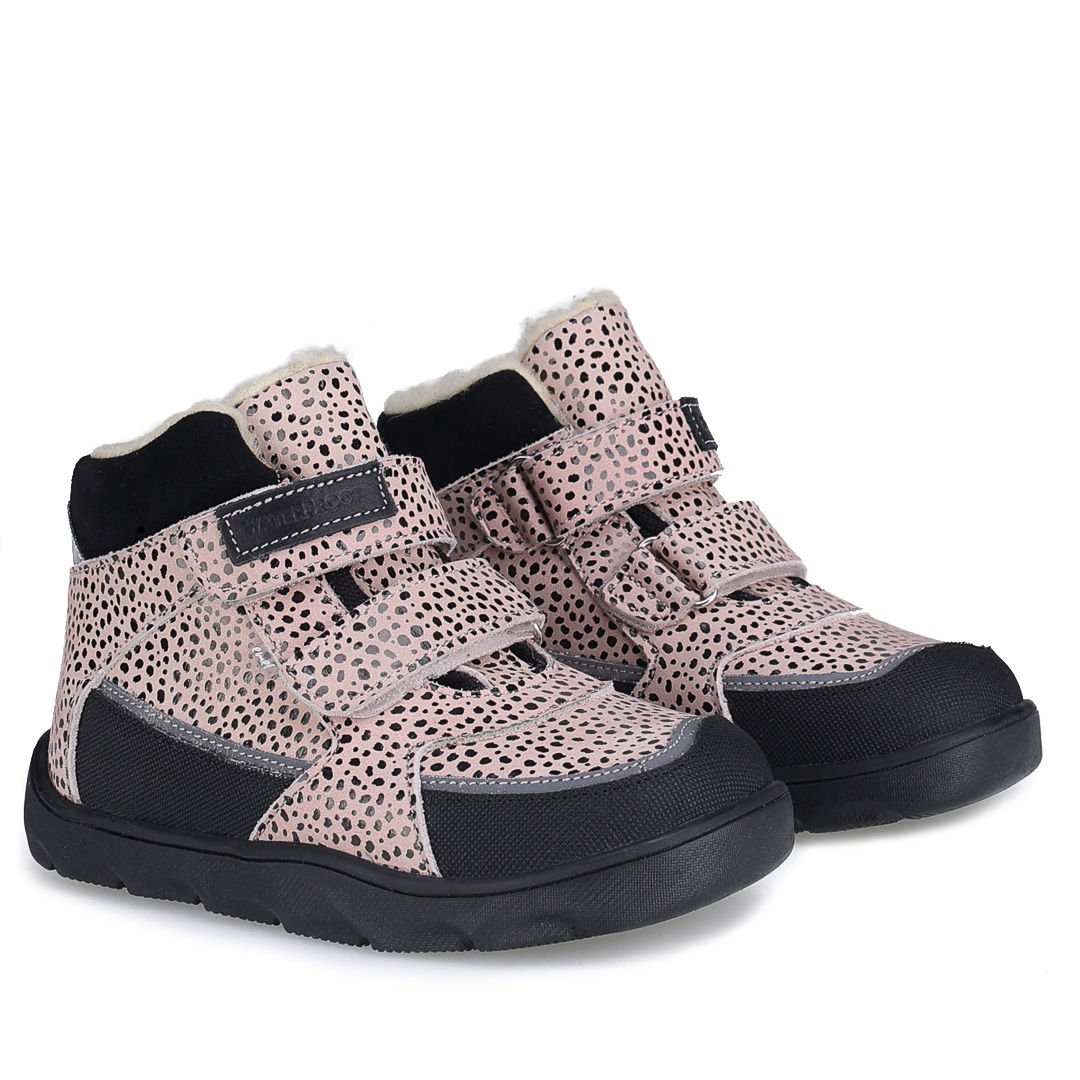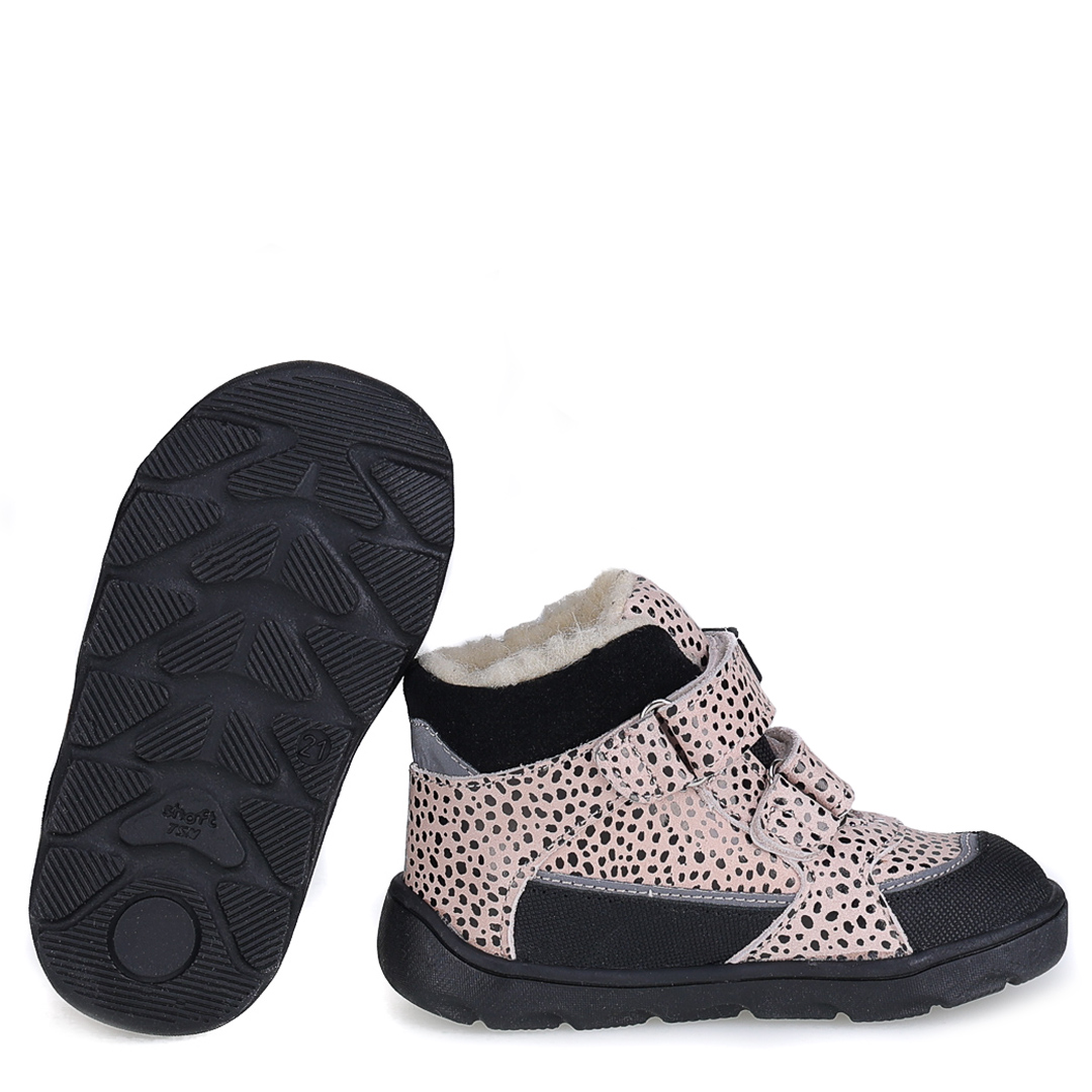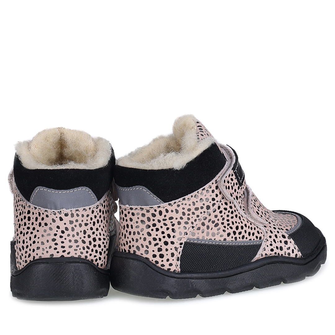 Beżowe trzewiki dziecięce Atlas Barefoot z czarnymi dodatkami i subtelnym błyskiem łączą sportowy fason z efektownym wykończeniem. Kontrastowe akcenty podkreślają nowoczesny design i sprawiają, że buty świetnie pasują do zimowego ubioru.