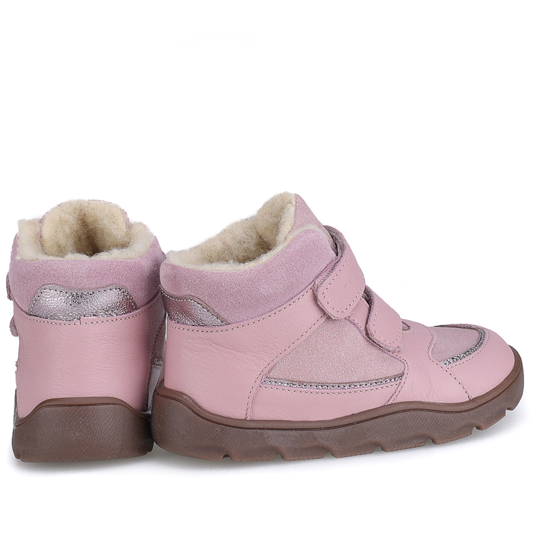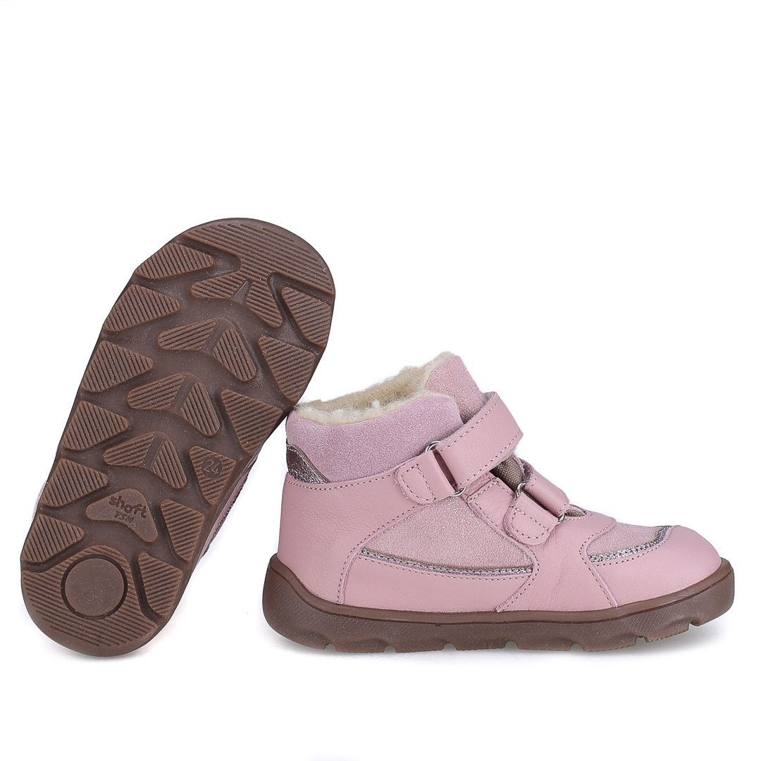 Różowe trzewiki dziecięce Atlas Barefoot z błyszczącymi wstawkami mają sportowy fason i nowoczesny design. Delikatny kolor i subtelny połysk sprawiają, że buty świetnie komponują się z zimowym ubiorem.