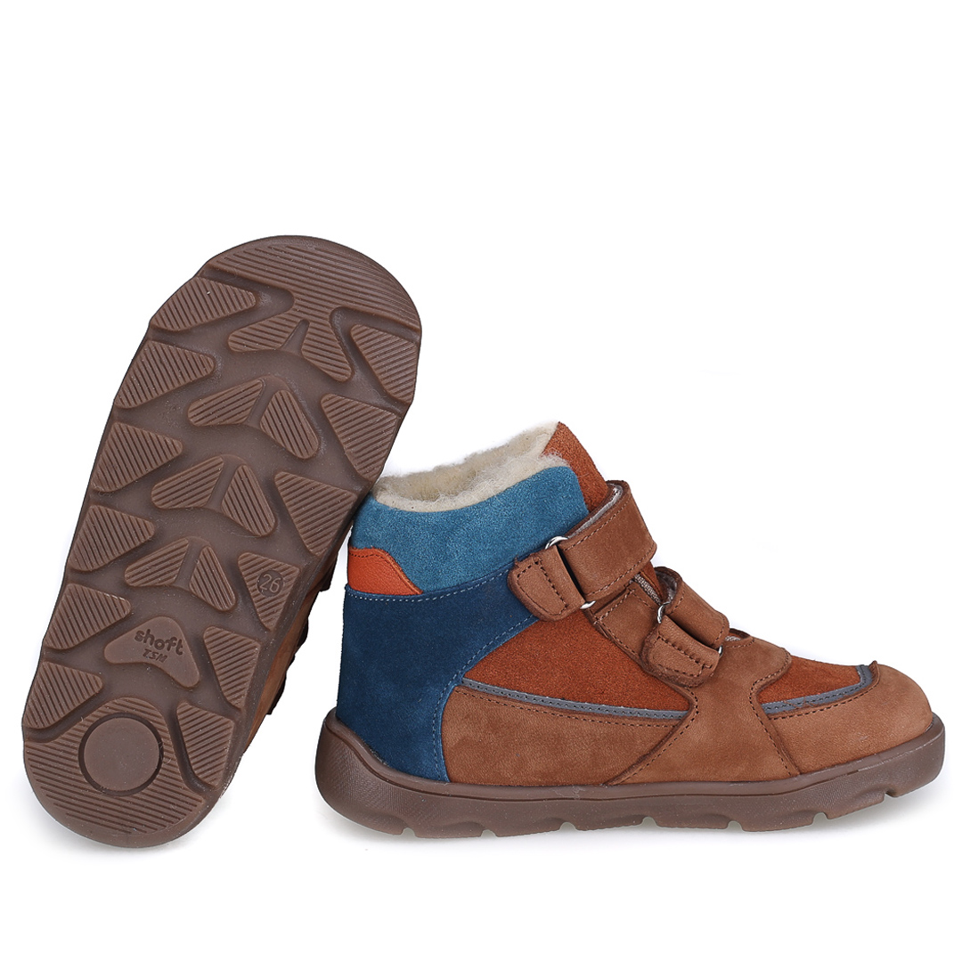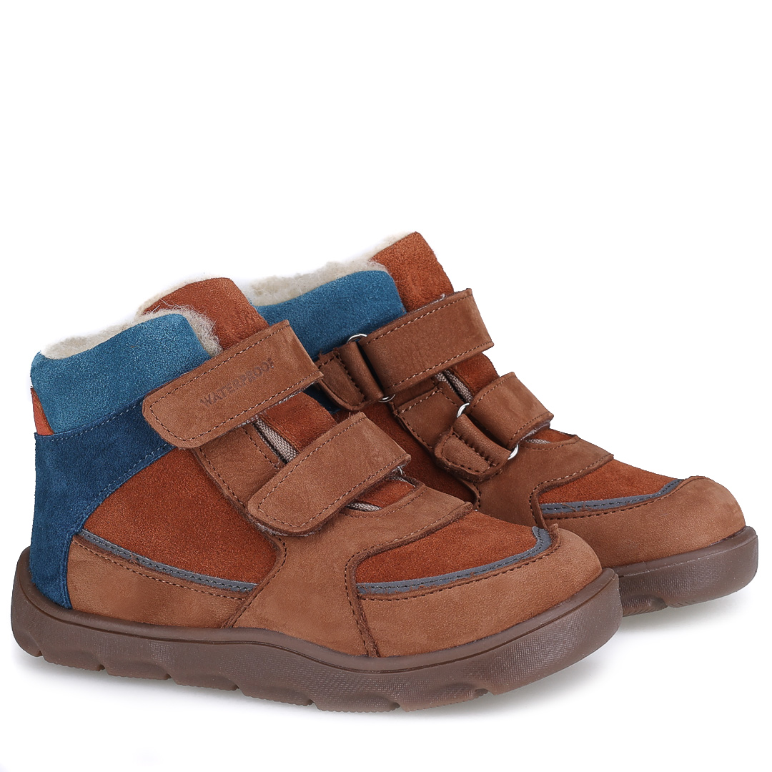 Brązowe trzewiki dziecięce z subtelnymi niebieskimi wstawkami wyróżniają się sportowym fasonem i nowoczesnym designem. Uniwersalny kolor i ponadczasowy wygląd sprawiają, że świetnie pasują do różnych zimowych stylizacji.