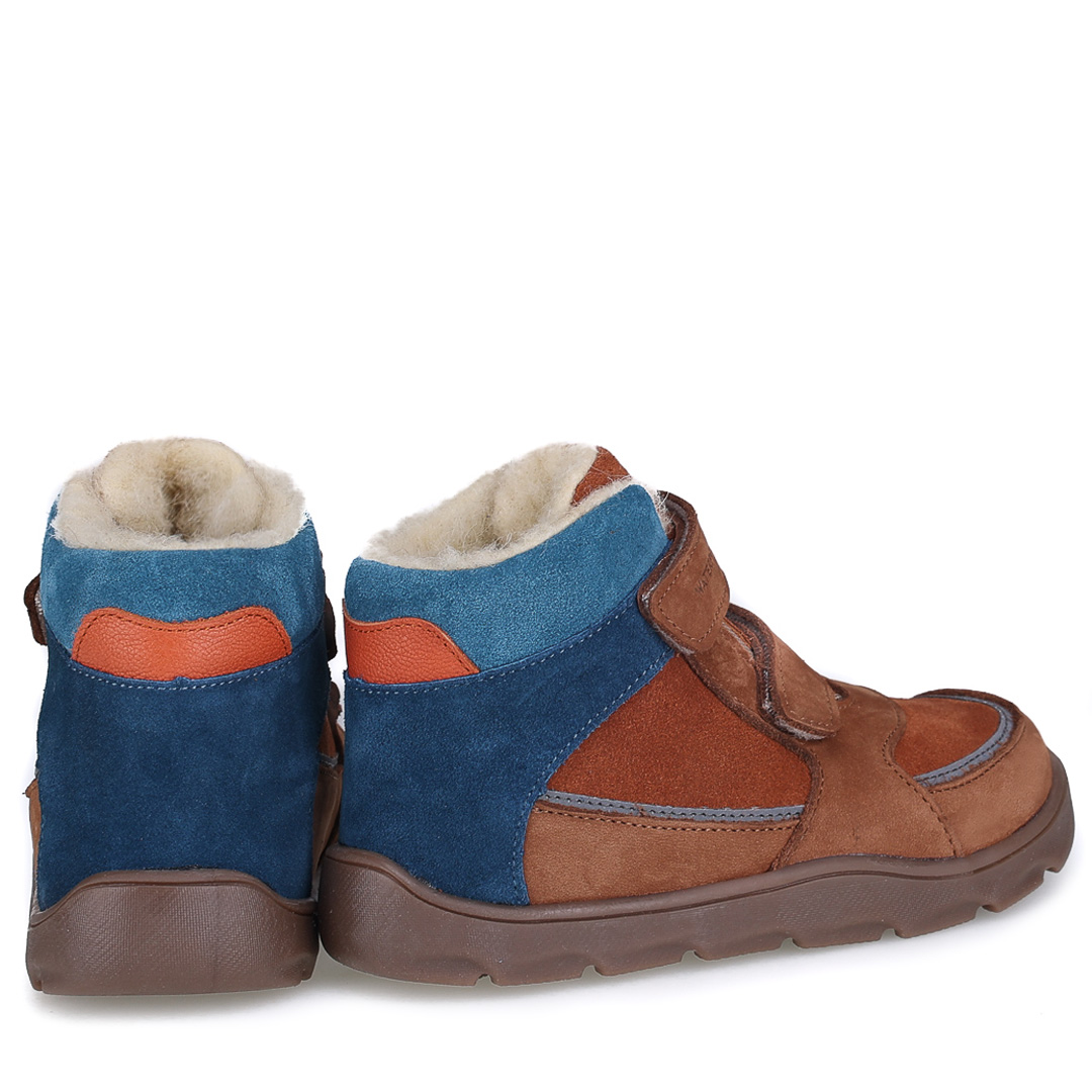Atlas Barefoot – Brązowe trzewiki dziecięce z niebieskimi wstawkami