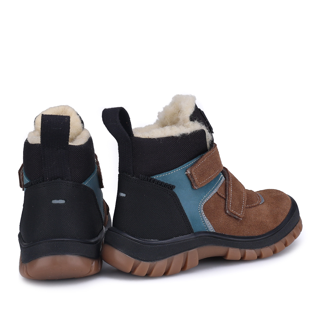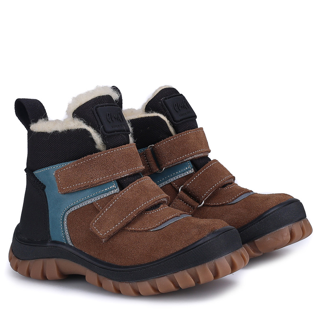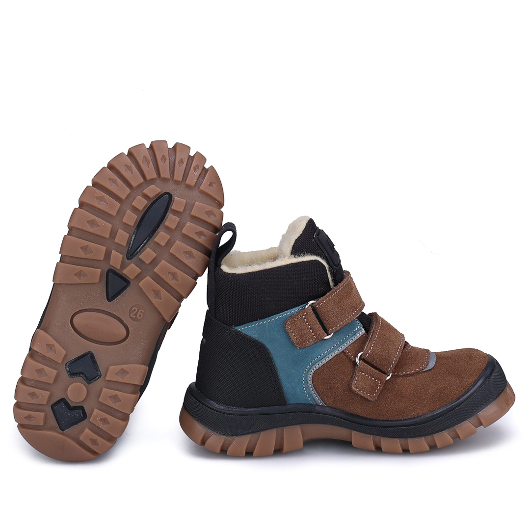 Harmonijne zestawienie kolorów – brązowa cholewka z niebieskimi detalami nadaje butom nowoczesny, sportowy charakter, a solidna podeszwa z głębokim bieżnikiem zapewnia stabilność i wygodę podczas zimowych aktywności dziecięcych.
