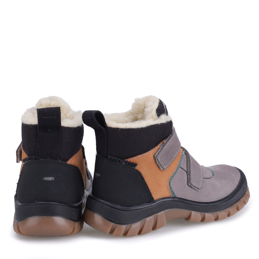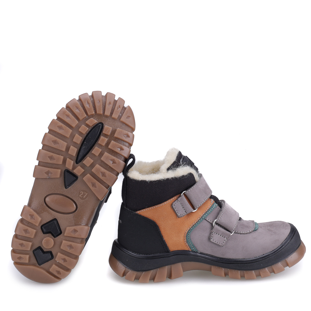 Naturalne zestawienie kolorów – szara cholewka z brązowymi detalami i subtelną miętową wstawką nadaje butom uniwersalny, nowoczesny charakter, a solidna podeszwa z głębokim bieżnikiem zapewnia stabilność i komfort podczas zimowych aktywności dziecięcych.