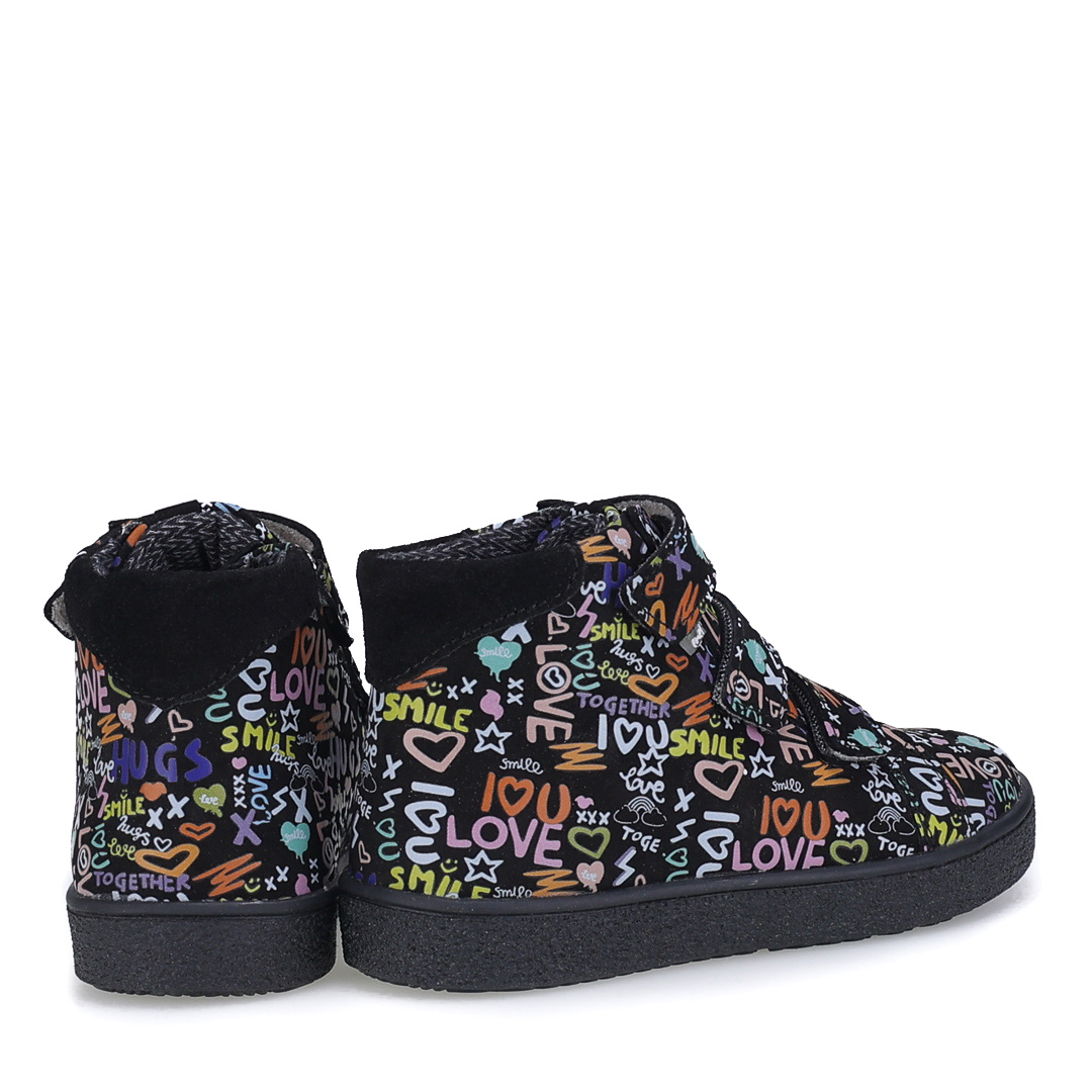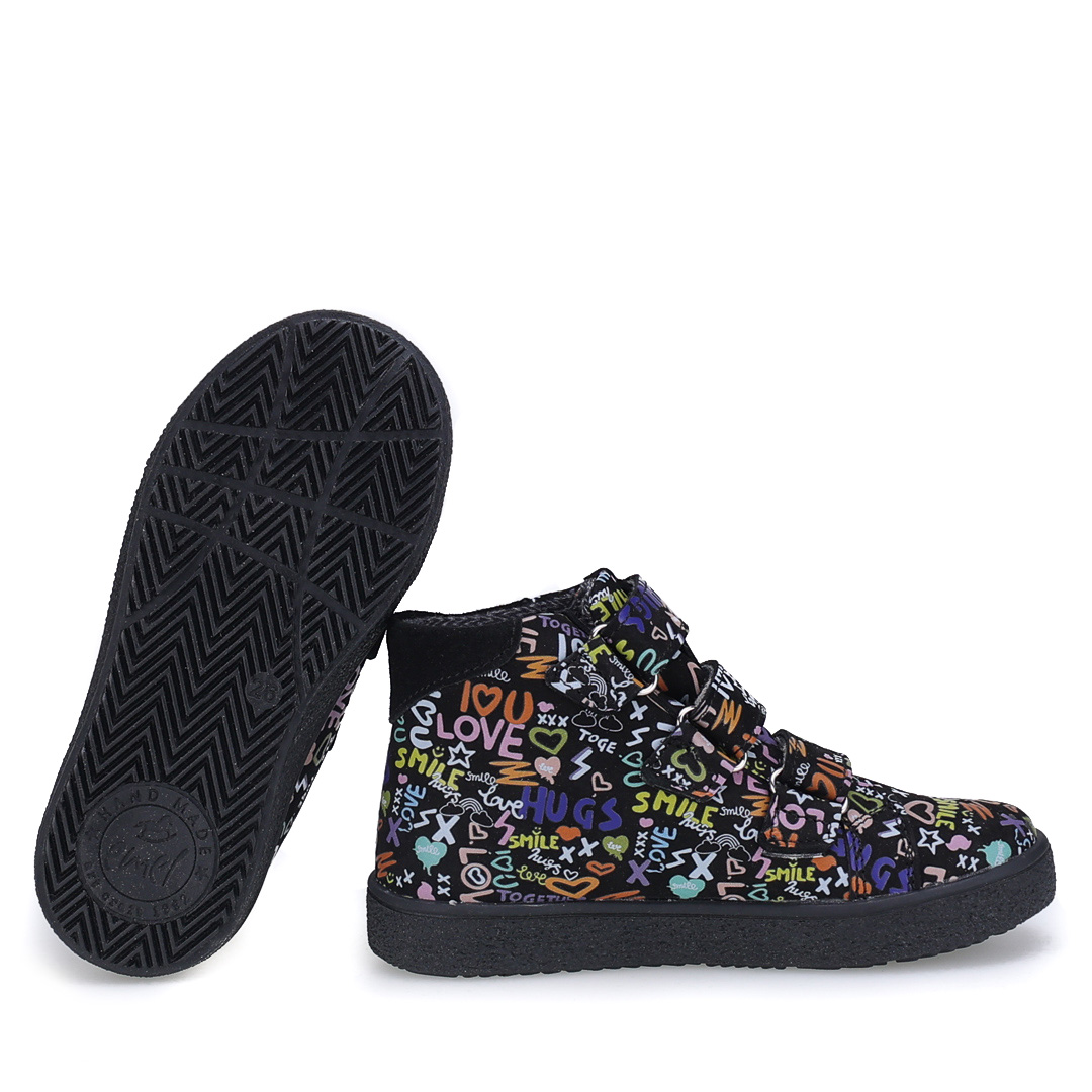 Czarne trampki Chester wyróżniają się kolorowymi napisami, które nadają im nowoczesny, dziewczęcy charakter. Połączenie klasycznej czerni z energetycznymi detalami sprawia, że buty doskonale pasują do codziennych stylizacji i dodają im wyrazistości.